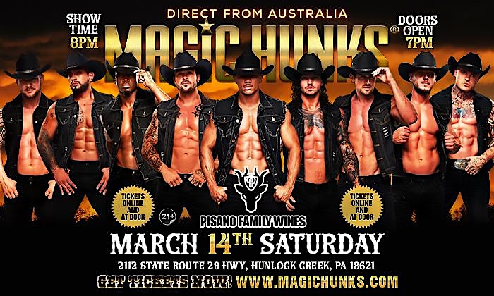 by admin05Mar MAGIC HUNKS® AUSTRALIA TAKEOVER HUNLOCK CREEK, PA USA!!! at Pisano – Hunlock, PA MAGIC HUNKS® AUSTRALIA TAKEOVER HUNLOCK CREEK, PA USA!!! at Pisano – Hunlock, PA 1 1 people viewed this event. Australia’s #1 Ladies Night Event Is Coming to Hunlock Creek! Limited Tickets On Sale NOW! Open to Ages 21+ Doors open at 7pm Tickets-RSVP Link Date And Time Saturday, March 14th, 2026 08:00 PM (PST) Venue Pisano Location 2112 Pennsylvania 29, Hunlock, PA 18621 Event Types Concert or PerformancePerforming & Visual Arts Event Category Pennsylvania Share With Friends Facebook Twitter Linkedin Xing Pinterest Share This Post: