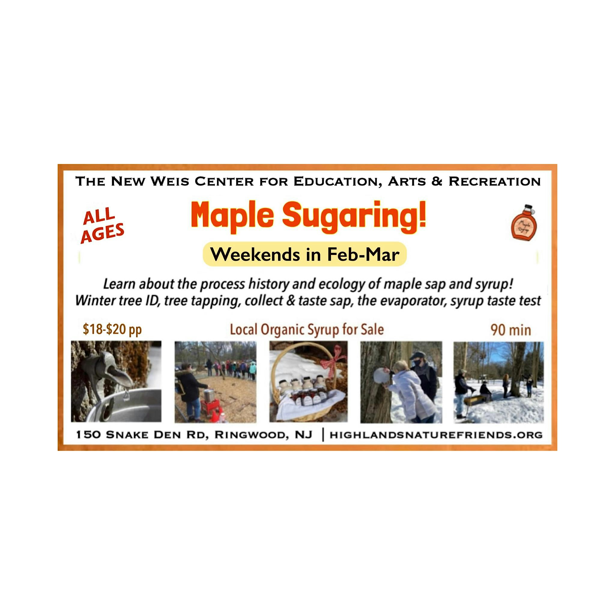 by admin27Feb Maple Sugaring! at The New Weis Center for Education, Arts & Recreation – Ringwood, NJ Maple Sugaring! at The New Weis Center for Education, Arts & Recreation – Ringwood, NJ 1 1 people viewed this event. Join us for everyone’s favorite seasonal program, as we learn about the process, history and ecology of maple sap and syrup. Tickets-RSVP Link Date And Time Saturday, March 14th, 2026 11:00 AM (PST) Venue The New Weis Center for Education, Arts & Recreation Location 150 Snake Den Road, Ringwood, NJ 7456 Event Types Festival or FairFood & Drink Event Category New Jersey Share With Friends Facebook Twitter Linkedin Xing Pinterest Share This Post: