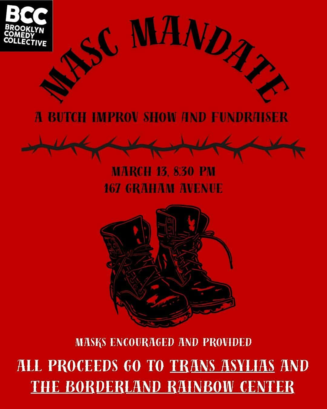 by admin14Feb Masc Mandate at Brooklyn Comedy Collective – Brooklyn, NY Masc Mandate at Brooklyn Comedy Collective – Brooklyn, NY 2 2 people viewed this event. Masc Mandate is an improv show that is made up of the funniest, hottest, most bad ass people in the world: BUTCHES! Tickets-RSVP Link Date And Time Saturday, March 14th, 2026 12:00 AM (PST) Venue Brooklyn Comedy Collective Location 167 Graham Avenue, Brooklyn, NY 11206 Event Types Concert or PerformancePerforming & Visual Arts Event Category New York Share With Friends Facebook Twitter Linkedin Xing Pinterest Share This Post:
