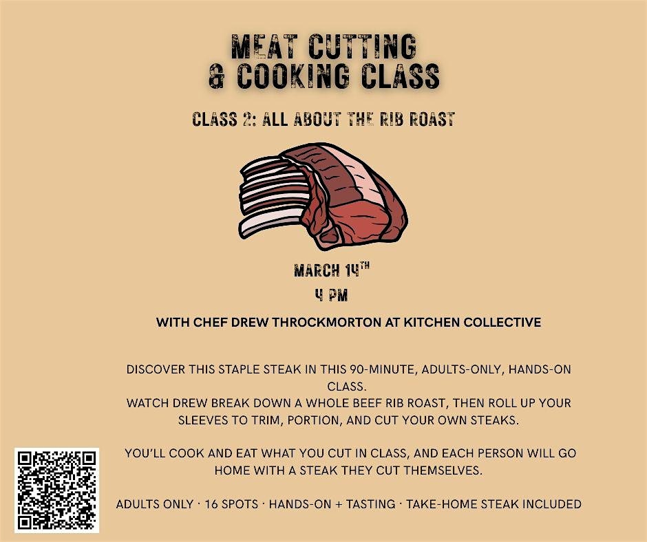 by admin24Feb Meat Cutting & Cooking Class ALL ABOUT THE RIB ROAST at 429 2nd St – Portsmouth, OH Meat Cutting & Cooking Class ALL ABOUT THE RIB ROAST at 429 2nd St – Portsmouth, OH 4 4 people viewed this event. Discover this staple steak in a 90 min hands on class. Learn how to cut and cook your own steak. Tickets-RSVP Link Date And Time Saturday, March 14th, 2026 04:00 PM (PST) Venue 429 2nd St Location 429 2nd Street, Portsmouth, OH 45662 Event Types Food & Drink Event Category Ohio Share With Friends Facebook Twitter Linkedin Xing Pinterest Share This Post: