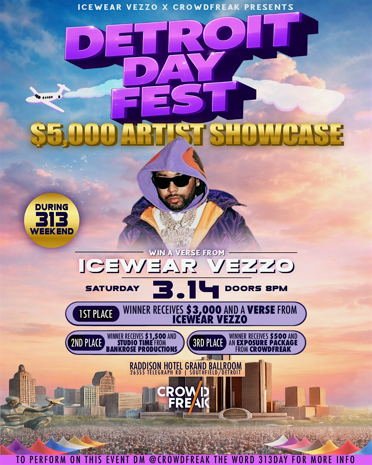by admin23Feb Midwest Got Talent: $5000 Artist Showcase w/ Icewear Vezzo & CrowdFreak at Radisson Hotel Southfield-Detroit – Southfield, MI Midwest Got Talent: $5000 Artist Showcase w/ Icewear Vezzo & CrowdFreak at Radisson Hotel Southfield-Detroit – Southfield, MI 1 1 people viewed this event. Icewear Vezzo & CrowdFreak presents THEE largest showcase with vendors, giveaways , and crazy large CASH PRIZES! Tickets-RSVP Link Date And Time Saturday, March 14th, 2026 03:00 PM (PST) Venue Radisson Hotel Southfield-Detroit Location 26555 Telegraph Road, Southfield, MI 48033 Event Types Concert or PerformanceMusic Event Category DetroitMichigan Share With Friends Facebook Twitter Linkedin Xing Pinterest Share This Post: