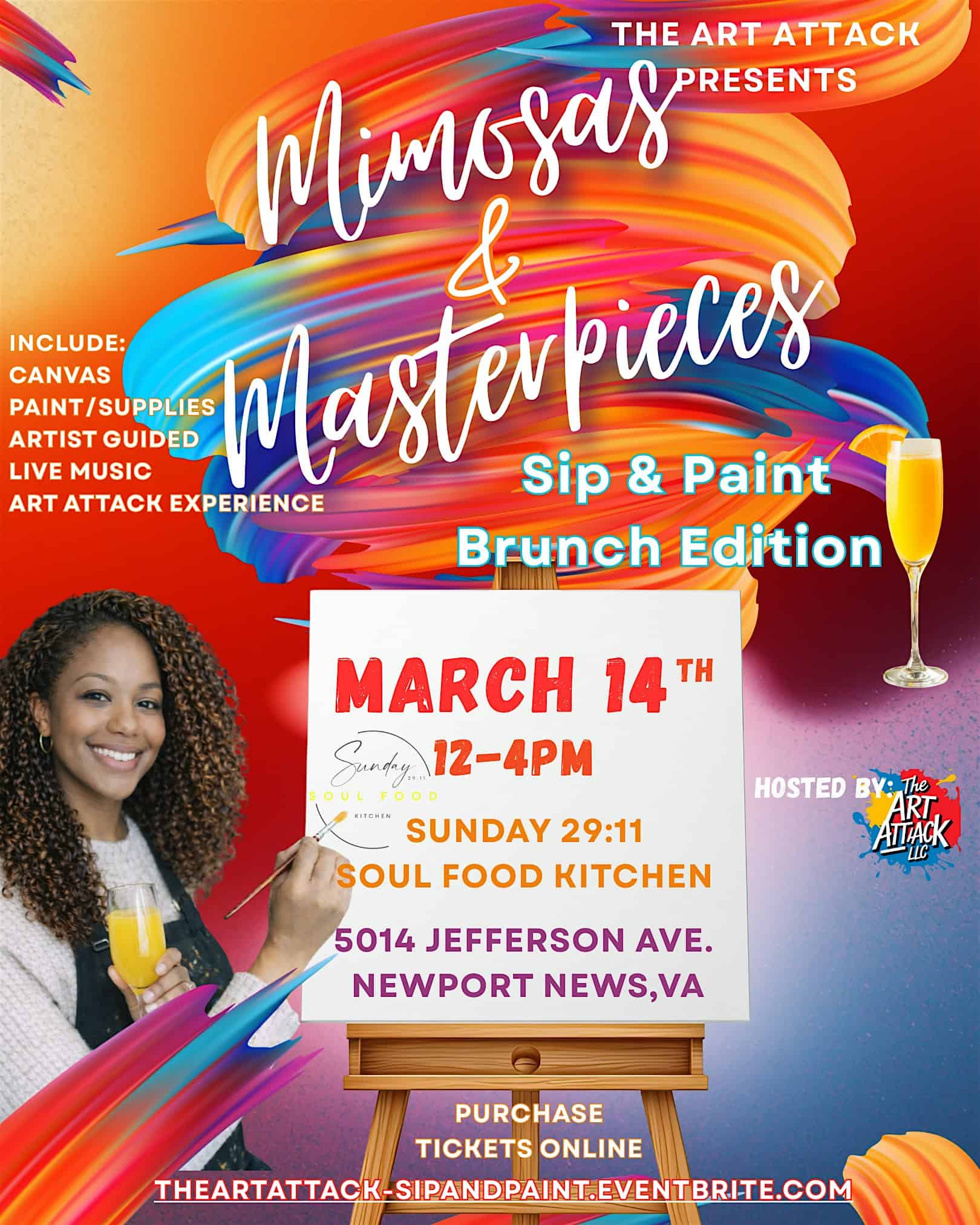 by admin14Feb MIMOSAS & MASTERPIECES: Sip & Paint Brunch Edition at Sunday 2911 Soul Food Kitchen LLC – Newport News, VA MIMOSAS & MASTERPIECES: Sip & Paint Brunch Edition at Sunday 2911 Soul Food Kitchen LLC – Newport News, VA 2 2 people viewed this event. Paint a little, sip a lot, vibe nonstop. Mimosas, R&B, and brunch vibes all in one fun experience! Tickets-RSVP Link Date And Time Saturday, March 14th, 2026 04:00 PM (PST) Venue Sunday 2911 Soul Food Kitchen LLC Location 5014 Jefferson Avenue, Newport News, VA 23605 Event Types Food & DrinkParty or Social Gathering Event Category Virginia Share With Friends Facebook Twitter Linkedin Xing Pinterest Share This Post: