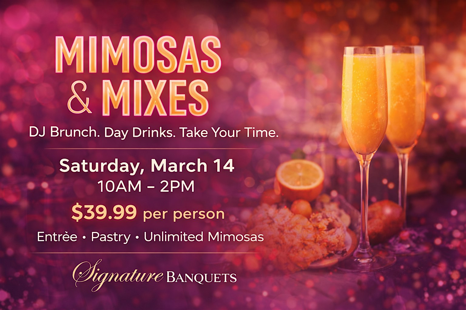 by admin13Feb Mimosas & Mixes Signature DJ Brunch at Signature Banquets – Lowell, IN Mimosas & Mixes Signature DJ Brunch at Signature Banquets – Lowell, IN 1 1 people viewed this event. A Saturday DJ brunch with brunch favorites, unlimited mimosas, and relaxed daytime vibes at Signature Banquets. Tickets-RSVP Link Date And Time Saturday, March 14th, 2026 03:00 PM (PST) Venue Signature Banquets Location 1908 E Commercial Ave, Lowell, IN 46356 Event Types Food & DrinkParty or Social Gathering Event Category Indiana Share With Friends Facebook Twitter Linkedin Xing Pinterest Share This Post: