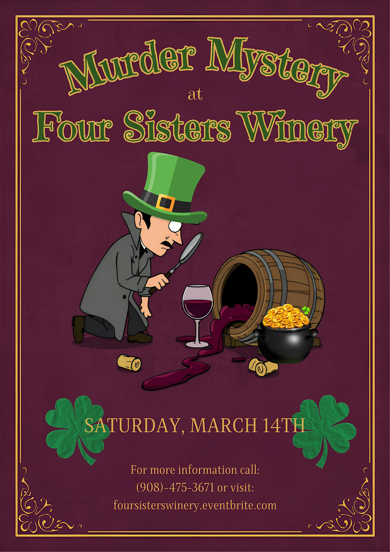 by admin13Feb Murder Mystery at Four Sisters Winery – Belvidere, NJ Murder Mystery at Four Sisters Winery – Belvidere, NJ 1 1 people viewed this event. Dive into the mystery and catch the culprit in our live Murder Mystery event—fun and suspense guaranteed! Tickets-RSVP Link Date And Time Saturday, March 14th, 2026 05:00 PM (PST) Venue Four Sisters Winery Location 783 County Road 519, Belvidere, NJ 7823 Event Types Food & DrinkParty or Social Gathering Event Category New Jersey Share With Friends Facebook Twitter Linkedin Xing Pinterest Share This Post: