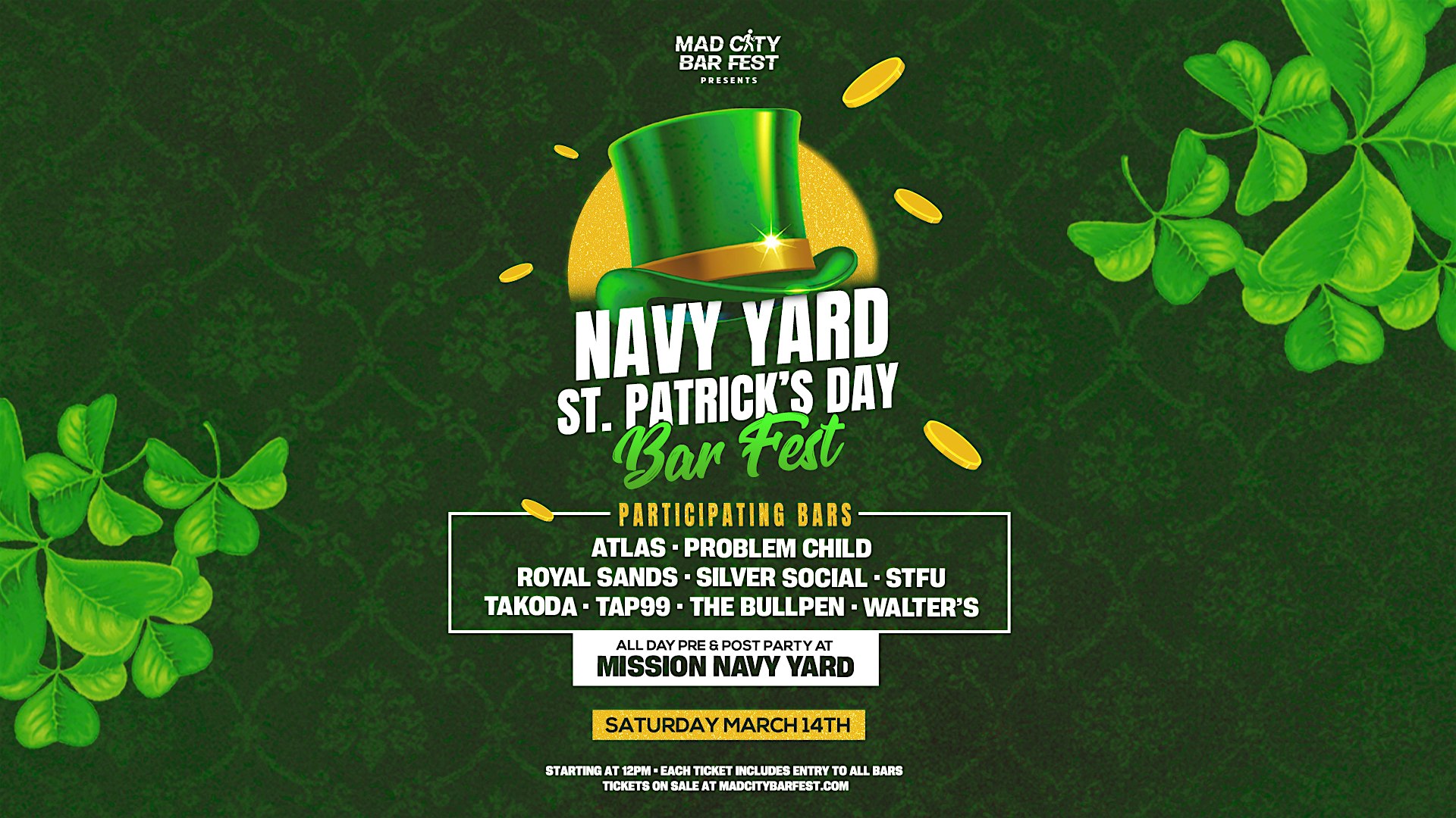 by admin13Feb Navy Yard St. Patrick’s Day Bar Fest at Navy Yard – Washington, DC Navy Yard St. Patrick’s Day Bar Fest at Navy Yard – Washington, DC 1 1 people viewed this event. One ticket. 10+ Bars & Clubs. NAVY YARD’S BIGGEST ST. PATRICK’S DAY EVENT! Tickets-RSVP Link Date And Time Saturday, March 14th, 2026 04:00 PM (PST) Venue Navy Yard Location Navy Yard, Washington, DC 20374 Event Types Party or Social GatheringSeasonal & Holiday Event Category Washington DC Share With Friends Facebook Twitter Linkedin Xing Pinterest Share This Post:
