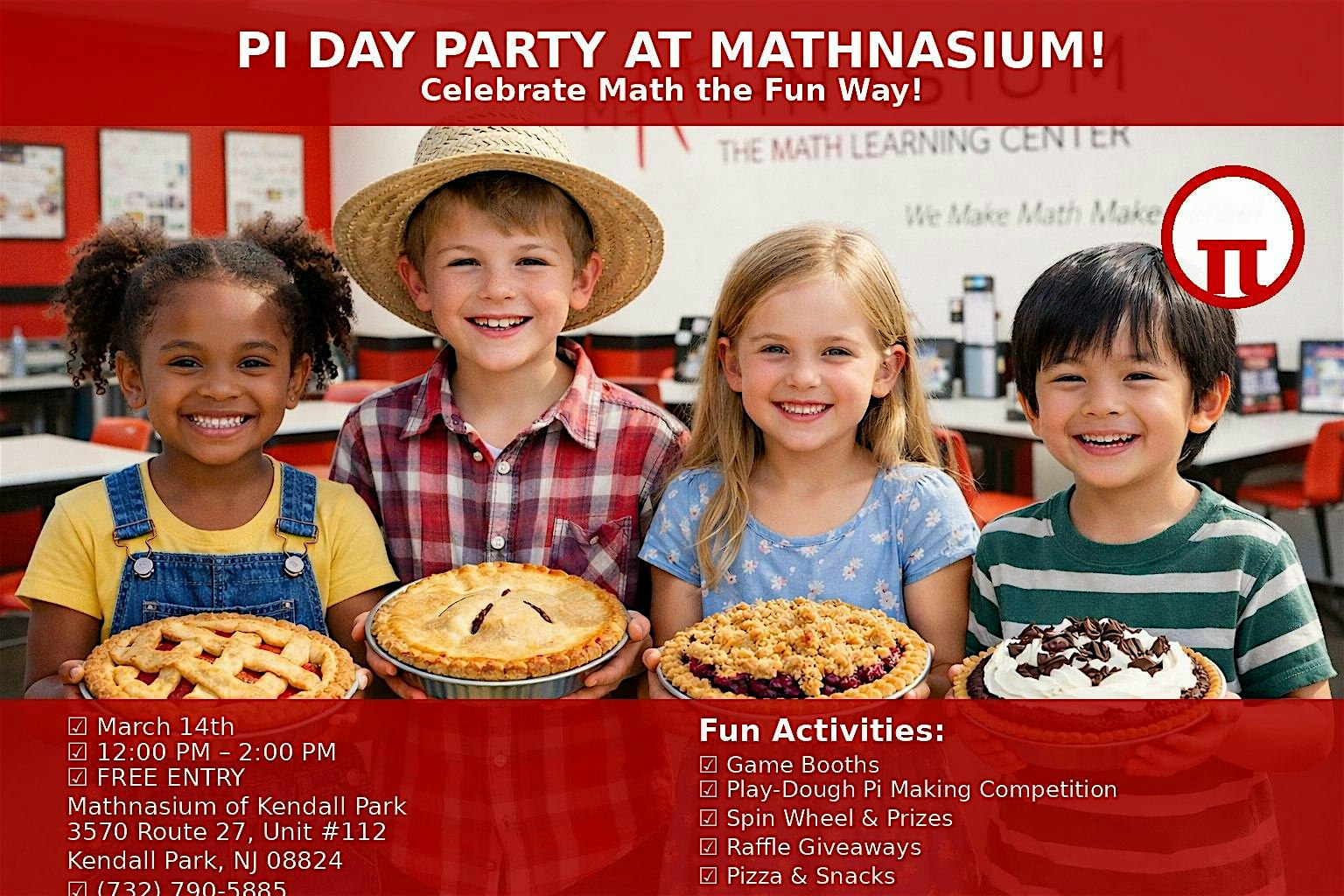 by admin24Feb PI Day Party @ Mathnasium of Kendall Park at 3570 NJ-27 unit 112 – South Brunswick Township, NJ PI Day Party @ Mathnasium of Kendall Park at 3570 NJ-27 unit 112 – South Brunswick Township, NJ 2 2 people viewed this event. Join us at Mathnasium of Kendall Park for a fun-filled PI Day Party with fun games, snacks, and cool math activities! Tickets-RSVP Link Date And Time Saturday, March 14th, 2026 12:00 PM (PST) Venue 3570 NJ-27 unit 112 Location 3570 New Jersey 27, South Brunswick Township, NJ 8824 Event Types Party or Social Gathering Event Category New Jersey Share With Friends Facebook Twitter Linkedin Xing Pinterest Share This Post: