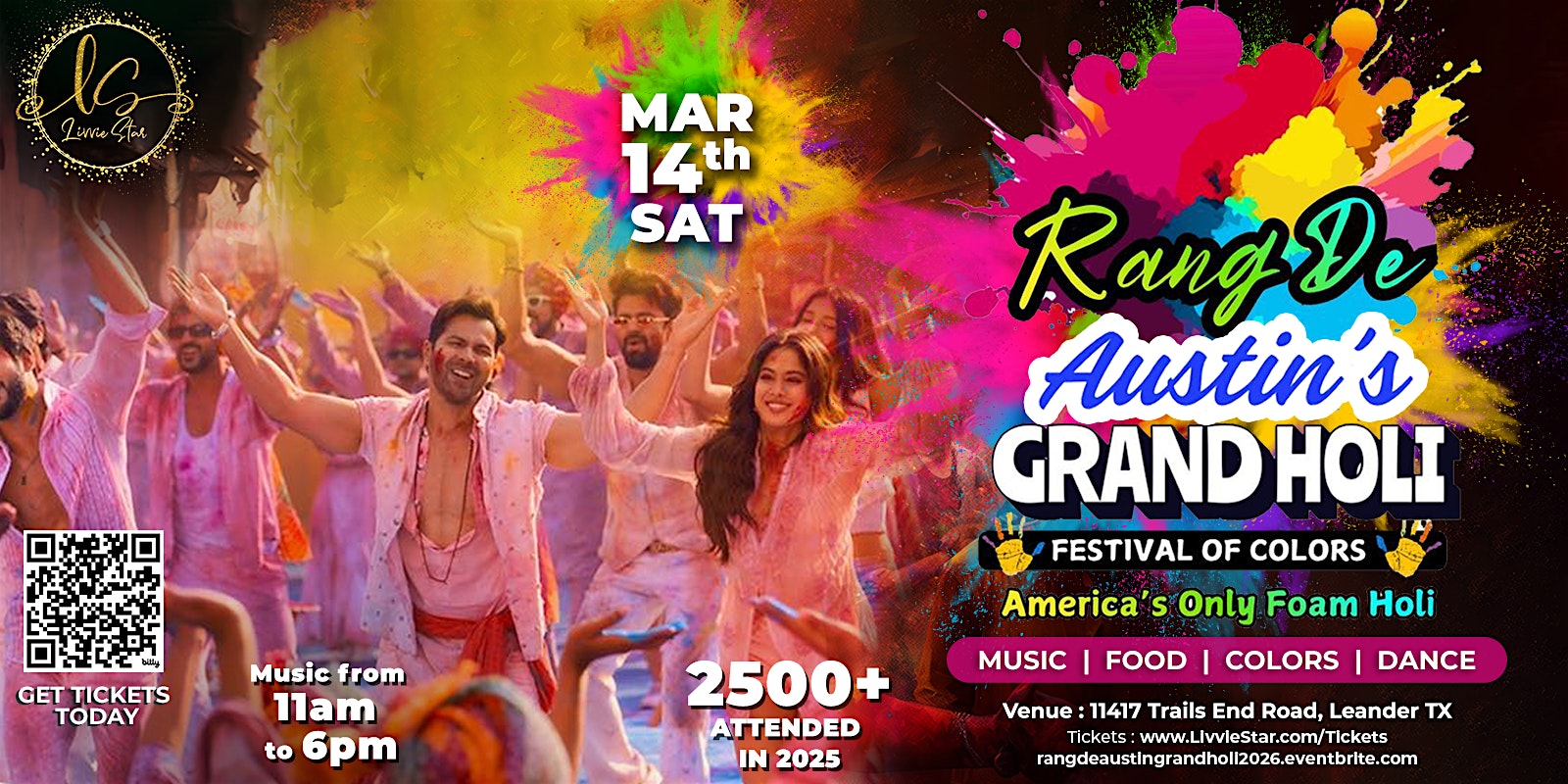 by admin13Feb RANG DE AUSTIN’S GRAND HOLI | FESTIVAL OF COLORS | US ONLY FOAM HOLI | 5TH at 11417 Trails End Rd – Leander, TX RANG DE AUSTIN’S GRAND HOLI | FESTIVAL OF COLORS | US ONLY FOAM HOLI | 5TH at 11417 Trails End Rd – Leander, TX 2 2 people viewed this event. ✨ Splash Into Colors, Groove in the Foam & Experience the Biggest Ranch Holi Ever! ✨ Tickets-RSVP Link Date And Time Saturday, March 14th, 2026 04:00 PM (PST) Venue 11417 Trails End Rd Location 11417 Trails End Road, Leander, TX 78641 Event Types Festival or FairMusic Event Category Texas Share With Friends Facebook Twitter Linkedin Xing Pinterest Share This Post: