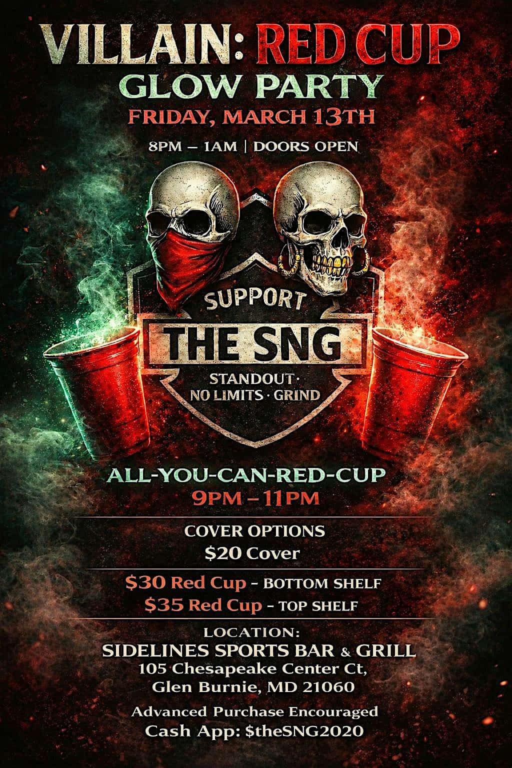 by admin14Feb Red Cup Glow Party at Sidelines Sports Bar & Grill – Glen Burnie, MD Red Cup Glow Party at Sidelines Sports Bar & Grill – Glen Burnie, MD 2 2 people viewed this event. Get ready for a dark, high-energy night at the Villain: Red Cup Glow Party hosted by The SNG and Sidelines Sports Bar & Grill. Tickets-RSVP Link Date And Time Saturday, March 14th, 2026 12:00 AM (PST) Venue Sidelines Sports Bar & Grill Location 105 Chesapeake Center Court, Glen Burnie, MD 21060 Event Types Food & DrinkParty or Social Gathering Event Category BaltimoreMaryland Share With Friends Facebook Twitter Linkedin Xing Pinterest Share This Post: