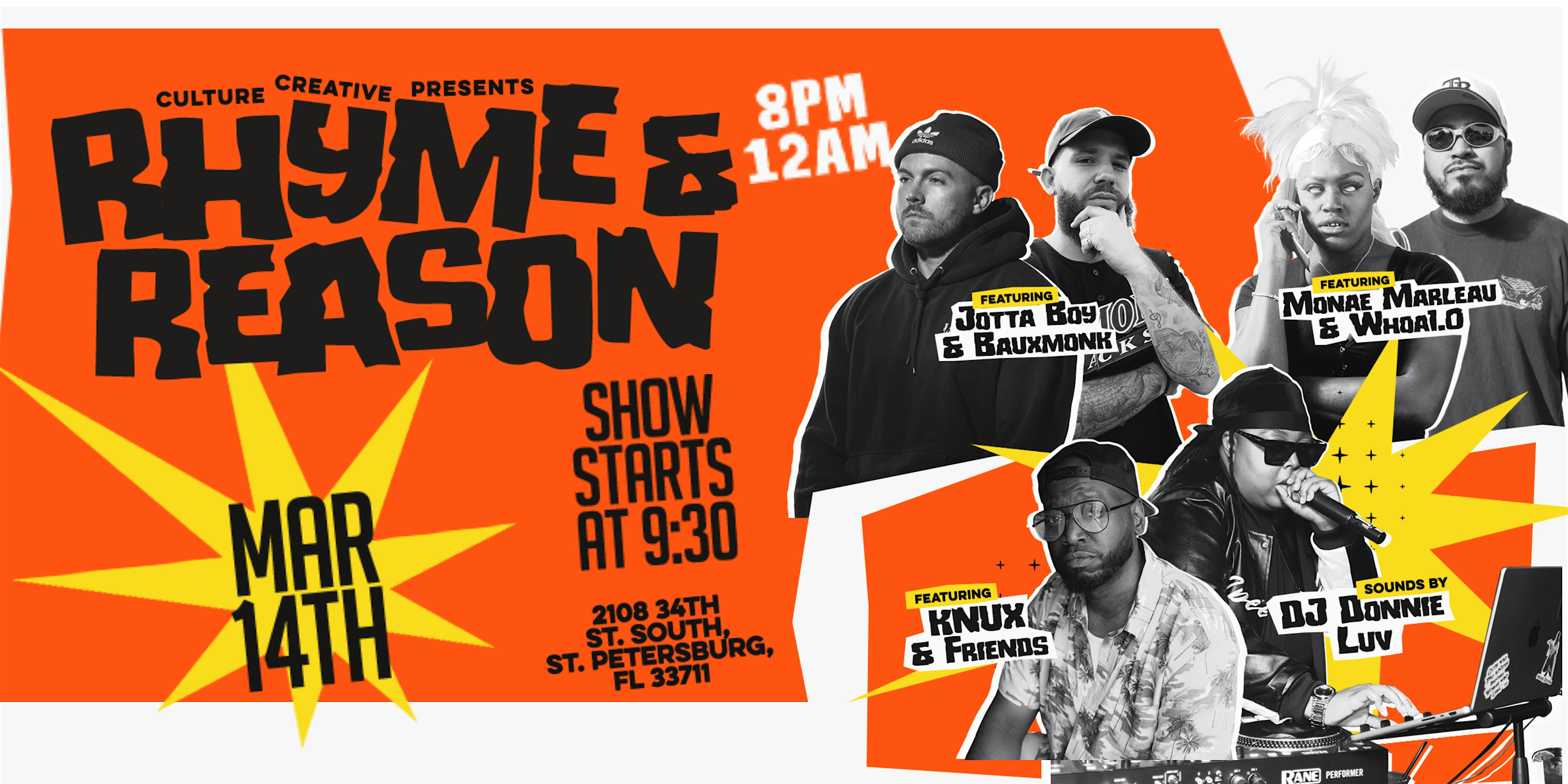 by admin05Mar RHYME & REASON at Culture Creative – St. Petersburg, FL RHYME & REASON at Culture Creative – St. Petersburg, FL 2 2 people viewed this event. RHYME & REASON pairs Tampa Bay hip hop artists with their producers for a live concert experience. Tickets-RSVP Link Date And Time Saturday, March 14th, 2026 08:00 PM (PST) Venue Culture Creative Location 2108 34th Street South, St. Petersburg, FL 33711 Event Types Concert or PerformancePerforming & Visual Arts Event Category Florida Share With Friends Facebook Twitter Linkedin Xing Pinterest Share This Post: