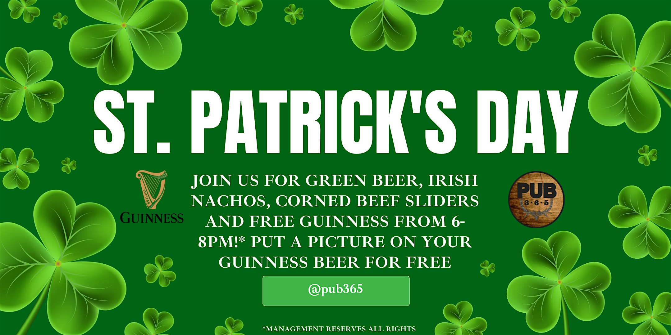by admin24Feb Ripple the Shamrock – A Guinness Celebration at Pub 365 at Pub 365 – Las Vegas, NV Ripple the Shamrock – A Guinness Celebration at Pub 365 at Pub 365 – Las Vegas, NV 3 3 people viewed this event. Get ready to raise a glass and soak up the good vibes with some classic Guinness fun and shamrock cheer! Tickets-RSVP Link Date And Time Saturday, March 14th, 2026 06:00 PM (PST) Venue Pub 365 Location 255 East Flamingo Road, Las Vegas, NV 89169 Event Types Food & DrinkParty or Social Gathering Event Category Las VegasNevada Share With Friends Facebook Twitter Linkedin Xing Pinterest Share This Post: