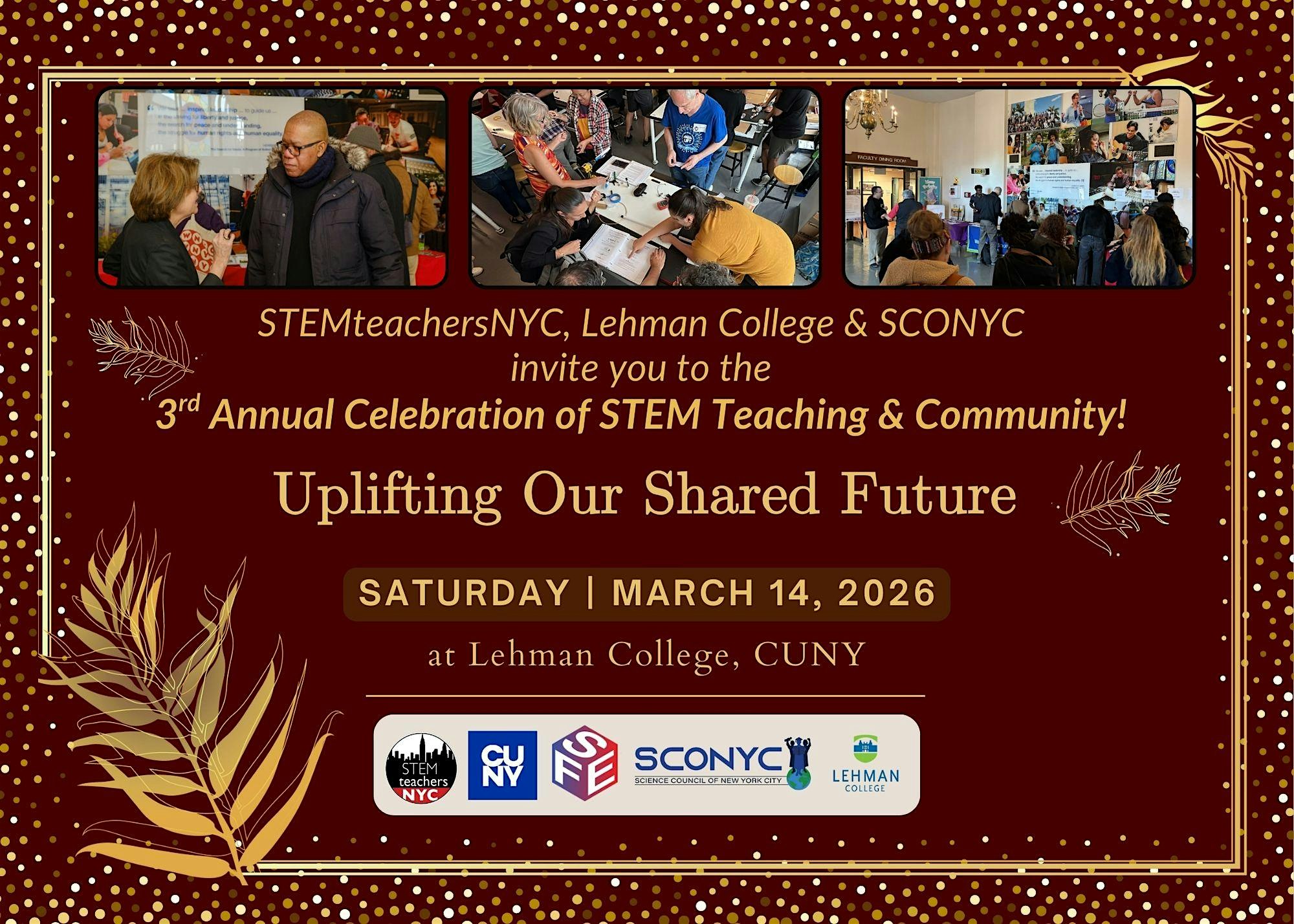 by admin13Feb RSVP for STEMteachersNYC 2026 Celebration of STEM Teaching & Community at Lehman College, CUNY – The Bronx, NY RSVP for STEMteachersNYC 2026 Celebration of STEM Teaching & Community at Lehman College, CUNY – The Bronx, NY 2 2 people viewed this event. Join us in 2026 as we uplift the pathways that support our new teachers and the potentials for the profession that we see on the horizon! Tickets-RSVP Link Date And Time Saturday, March 14th, 2026 12:00 PM (PST) Venue Lehman College, CUNY Location 250 Bedford Park Boulevard West, The Bronx, NY 10468 Event Types Party or Social Gathering Event Category New YorkNew York City Share With Friends Facebook Twitter Linkedin Xing Pinterest Share This Post: