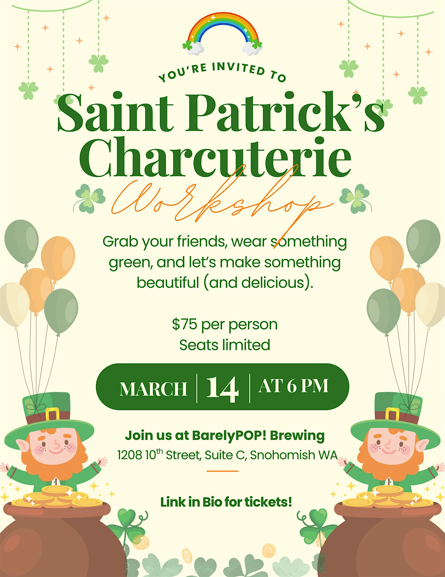 by admin24Feb Saint Patrick’s Charcuterie Workshop at Barley POP! Brewing – Snohomish, WA Saint Patrick’s Charcuterie Workshop at Barley POP! Brewing – Snohomish, WA 3 3 people viewed this event. Join us for a fun, hands-on Saint Patrick’s Charcuterie Workshop and craft delicious Irish-inspired boards! Tickets-RSVP Link Date And Time Saturday, March 14th, 2026 06:00 PM (PST) Venue Barley POP! Brewing Location 1208 10th Street, Snohomish, WA 98290 Event Types Food & Drink Event Category Washington Share With Friends Facebook Twitter Linkedin Xing Pinterest Share This Post: