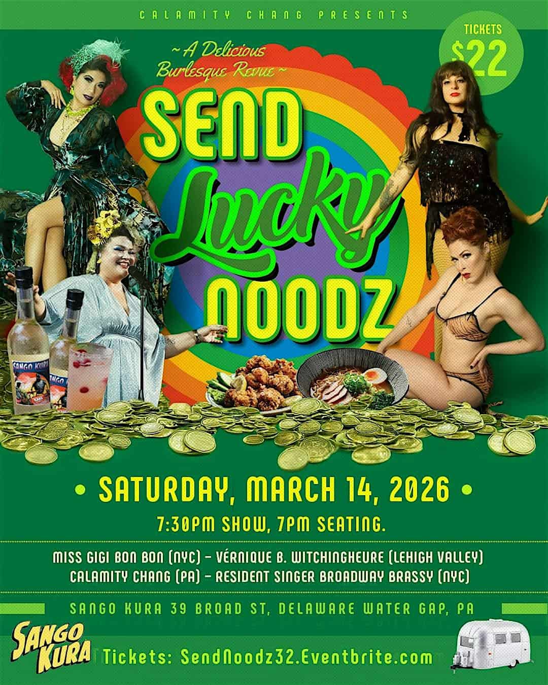 by admin14Feb Send Lucky Noodz! at Sango Kura – Delaware Water Gap, PA Send Lucky Noodz! at Sango Kura – Delaware Water Gap, PA 2 2 people viewed this event. A glamour filled night of vintage burlesque, tasteful & fun for couples, friends night out, all welcome, at Delaware Water Gap’s Sango Kura! Tickets-RSVP Link Date And Time Saturday, March 14th, 2026 11:00 PM (PST) Venue Sango Kura Location 39 Broad Street, Delaware Water Gap, PA 18327 Event Types Concert or PerformancePerforming & Visual Arts Event Category Pennsylvania Share With Friends Facebook Twitter Linkedin Xing Pinterest Share This Post:
