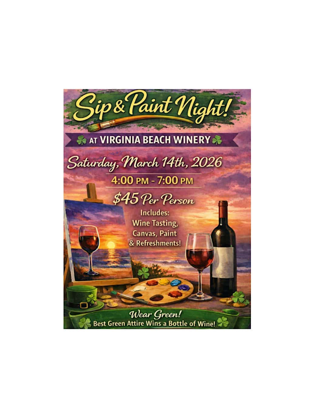 by admin24Feb Sip and Paint with a Purpose at Virginia Beach Winery – Virginia Beach, VA Sip and Paint with a Purpose at Virginia Beach Winery – Virginia Beach, VA 1 1 people viewed this event. Join us for Purposeful Pauses Sip & Paint Night—an evening of creativity, relaxation, and connection. Best green wins a bottle of wine! Tickets-RSVP Link Date And Time Saturday, March 14th, 2026 04:00 PM (PST) Venue Virginia Beach Winery Location 1064 Lynnhaven Parkway, Virginia Beach, VA 23452 Event Types Food & Drink Event Category VirginiaVirginia Beach Share With Friends Facebook Twitter Linkedin Xing Pinterest Share This Post: