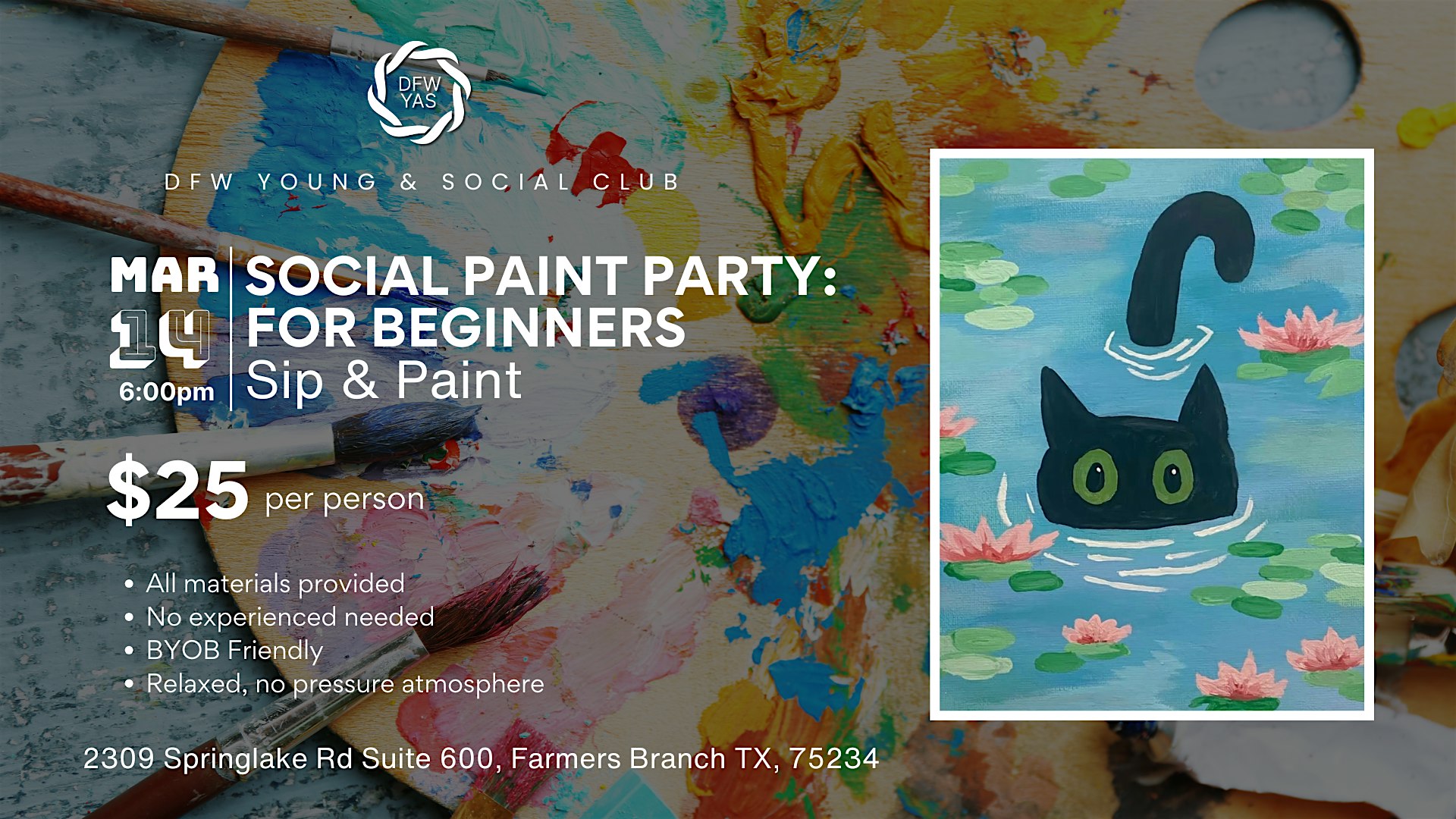 by admin27Feb Social Paint Party for Beginners | Sip & Paint at DFW Young & Social – Farmers Branch, TX Social Paint Party for Beginners | Sip & Paint at DFW Young & Social – Farmers Branch, TX 1 1 people viewed this event. Join us for a relaxed and social paint party designed for beginners and anyone looking to enjoy a creative night without pressure. Tickets-RSVP Link Date And Time Saturday, March 14th, 2026 @ 06:00 PM Location 2309 Springlake Rd, Farmers Branch, TX 75234 Event Types Party or Social GatheringPerforming & Visual Arts Event Category Texas Share With Friends Facebook Twitter Linkedin Xing Pinterest Share This Post:
