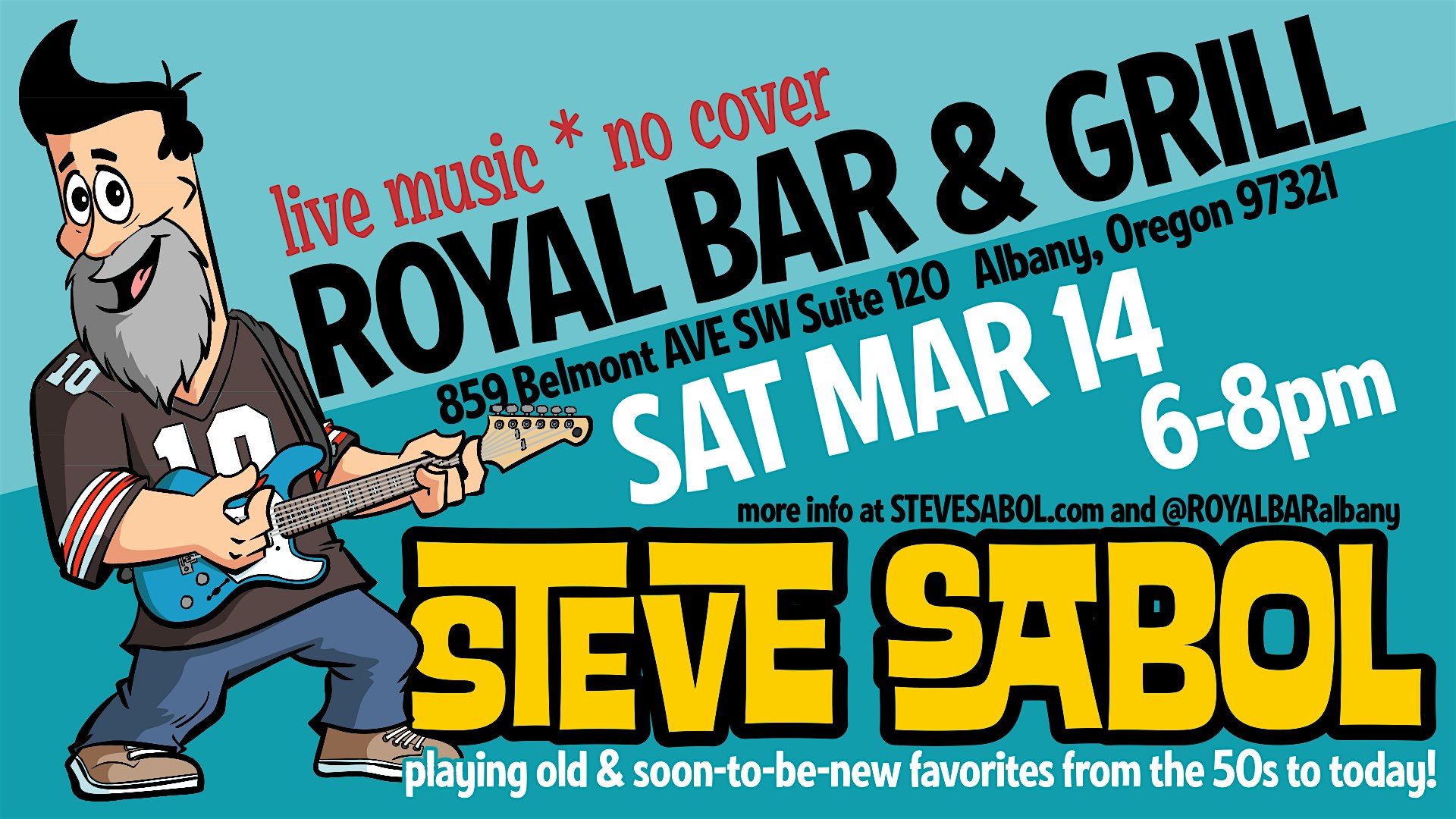 by admin27Feb Solo Live Music by Steve Sabol at Royal bar & Grill – Albany, OR Solo Live Music by Steve Sabol at Royal bar & Grill – Albany, OR 1 1 people viewed this event. Chill out with Steve Sabol’s solo live tunes—intimate vibes and great music in person! No cover fee. Full menu & Full bar open Tickets-RSVP Link Date And Time Saturday, March 14th, 2026 06:00 PM (PST) Venue Royal bar & Grill Location 859 Belmont Ave SW, Albany, OR 97321 Event Types Concert or PerformanceMusic Event Category Oregon Share With Friends Facebook Twitter Linkedin Xing Pinterest Share This Post: