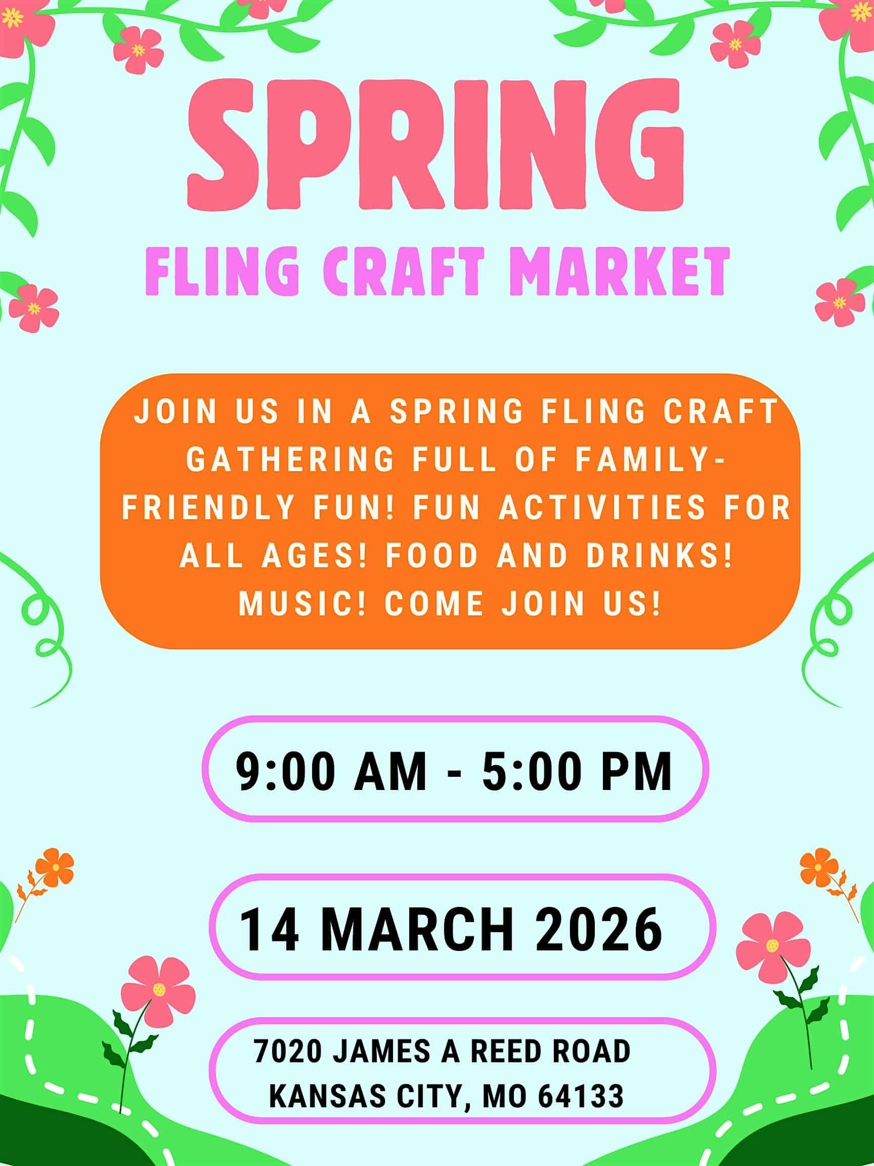 by admin14Feb Spring Fling Craft Show at Gregory Hills at New Journey Church of God Holiness – Kansas City, MO Spring Fling Craft Show at Gregory Hills at New Journey Church of God Holiness – Kansas City, MO 3 3 people viewed this event. Join us at the Spring Fling Craft Show for awesome handmade goods and good vibes in person! Tickets-RSVP Link Date And Time Saturday, March 14th, 2026 02:00 PM (PST) Venue Gregory Hills at New Journey Church of God Holiness Location 7020 James A Reed Road, Kansas City, MO 64133 Event Types Festival or FairFood & Drink Event Category Kansas CityMissouri Share With Friends Facebook Twitter Linkedin Xing Pinterest Share This Post: