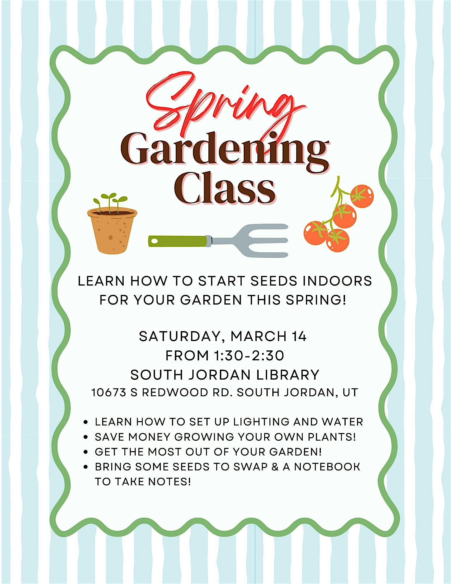 Spring Seed Starting Class at South Jordan Library – South Jordan, UT Spring Seed Starting Class at South Jordan Library – South Jordan, UT 1 1 people viewed this event. Join us to learn how to start seeds indoors for your garden this spring! Tickets-RSVP Link Register for event Date And Time Saturday, March 14th, 2026 @ 01:00 PM Location 10673 South Redwood Road, South Jordan, UTÂ 84095 Event Types Class, Training, or WorkshopFood & Drink Event Category Utah Share With Friends Facebook Twitter Linkedin Xing Pinterest