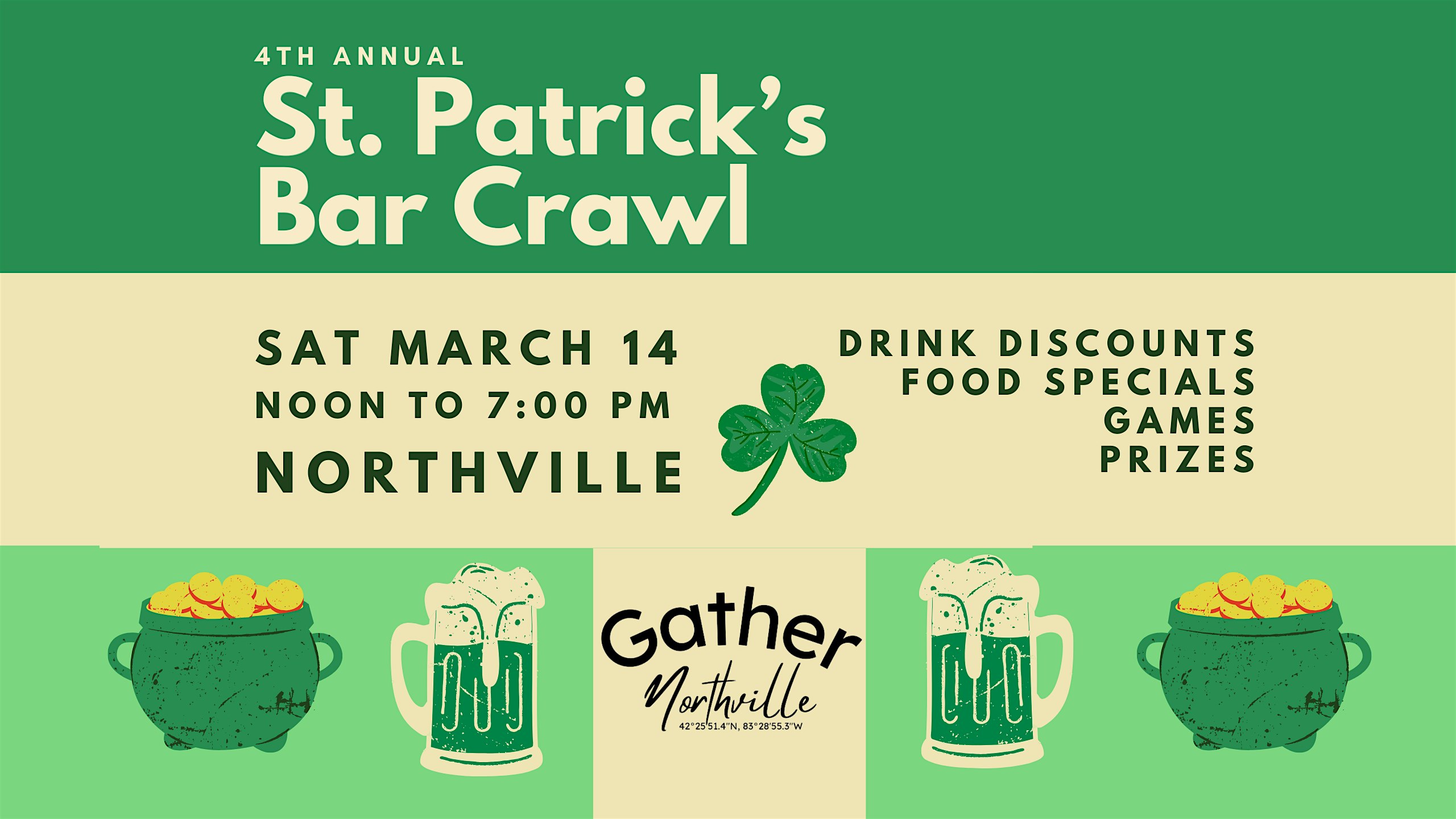 by admin13Feb St. Patrick’s Bar Crawl Northville at Great White Buffalo Brewing Co. – Northville, MI St. Patrick’s Bar Crawl Northville at Great White Buffalo Brewing Co. – Northville, MI 2 2 people viewed this event. Celebrate St. Patrick’s Day early with exclusive drink and food discounts in Northville’s Social District! Tickets-RSVP Link Date And Time Saturday, March 14th, 2026 04:00 PM (PST) Venue Great White Buffalo Brewing Co. Location 101 West Main Street, Northville, MI 48167 Event Types Party or Social GatheringSeasonal & Holiday Event Category Michigan Share With Friends Facebook Twitter Linkedin Xing Pinterest Share This Post: