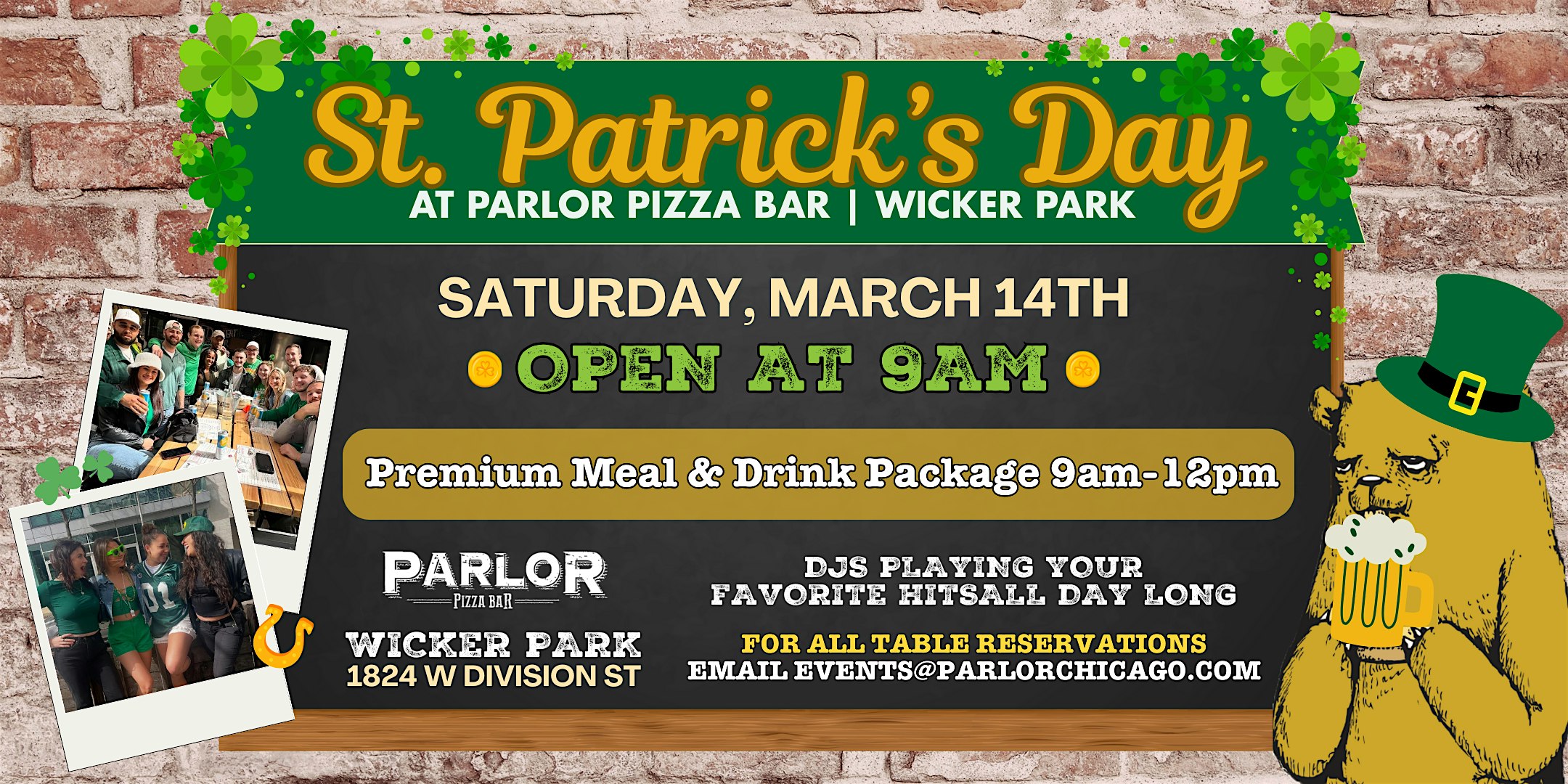 by admin24Feb St. Patrick’s Day at Parlor Wicker Park at Parlor Pizza Bar Wicker Park – Chicago, IL St. Patrick’s Day at Parlor Wicker Park at Parlor Pizza Bar Wicker Park – Chicago, IL 2 2 people viewed this event. Lay your Paddy’s party-foundation down at Parlor (Wicker Park)! Where top of the line food & beverage collide with an expansive venue space, Tickets-RSVP Link Date And Time Saturday, March 14th, 2026 09:00 AM (PST) Venue Parlor Pizza Bar Wicker Park Location 1824 W Division, Chicago, IL 60622 Event Types Party or Social GatheringSeasonal & Holiday Event Category ChicagoIllinois Share With Friends Facebook Twitter Linkedin Xing Pinterest Share This Post: