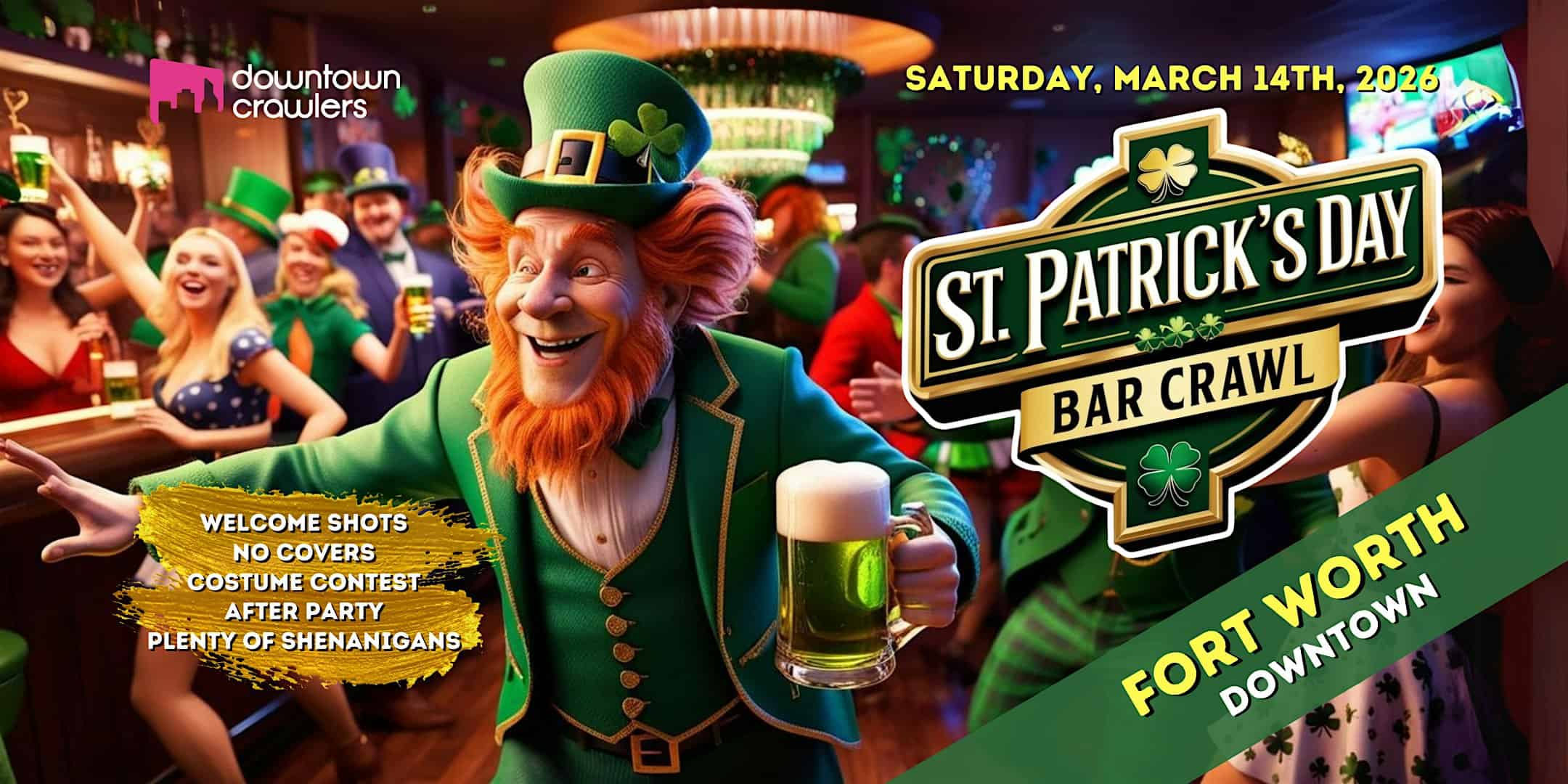 by admin14Feb St. Patrick’s Day Bar Crawl 3/14 – FORT WORTH at Junk Punch – Fort Worth, TX St. Patrick’s Day Bar Crawl 3/14 – FORT WORTH at Junk Punch – Fort Worth, TX 2 2 people viewed this event. Fort Worth’s premier St. Patrick’s Day Bar Crawl – the best party in town. Enjoy welcome shots, drink specials, costume contest and more Tickets-RSVP Link Date And Time Saturday, March 14th, 2026 10:00 PM (PST) Venue Junk Punch Location 2805 Bledsoe Street, Fort Worth, TX 76107 Event Types Party or Social GatheringSeasonal & Holiday Event Category Fort WorthTexas Share With Friends Facebook Twitter Linkedin Xing Pinterest Share This Post: