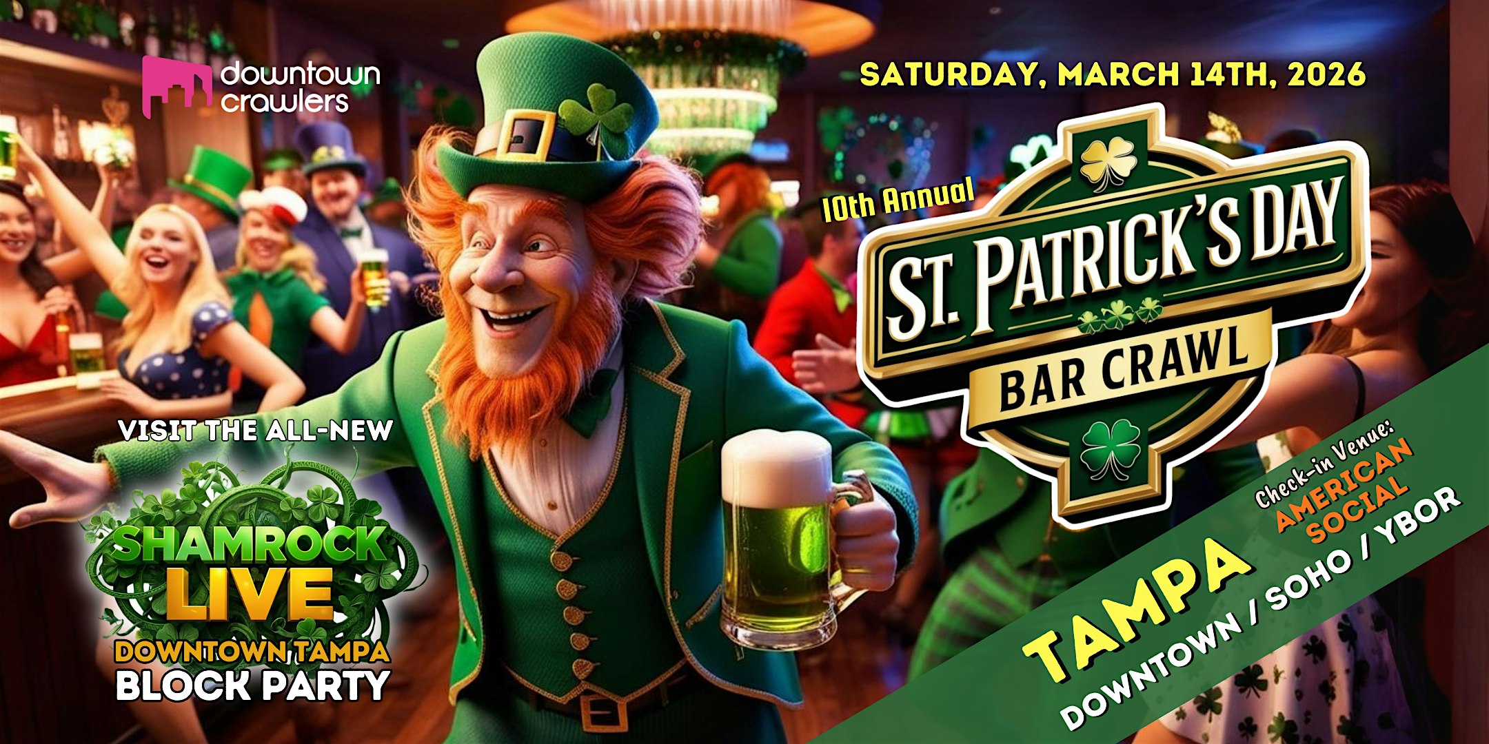 St. Patrick’s Day Bar Crawl + Block Party 3/14 – TAMPA (American Social) at American Social – Tampa – Tampa, FL St. Patrick’s Day Bar Crawl + Block Party 3/14 – TAMPA (American Social) at American Social – Tampa – Tampa, FL 1 1 people viewed this event. Tampa’s premier St. Patrick’s Day Bar Crawl. Enjoy welcome shots, VIP upgrades and the all new Shamrock LIVE Block Party with live DJs. Tickets-RSVP Link Register for event Date And Time Saturday, March 14th, 2026 @ 04:00 PM Location 601 South Harbour Island Boulevard, Tampa, FLĀ 33602 Event Types Party or Social GatheringSeasonal & Holiday Event Category FloridaTampa Share With Friends Facebook Twitter Linkedin Xing Pinterest