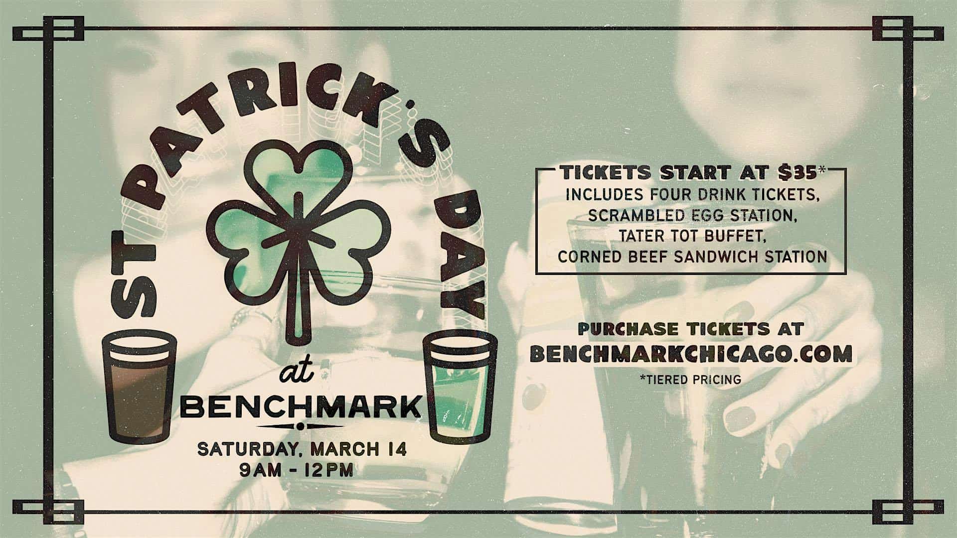 by admin14Feb St. Patrick’s Day Party at Benchmark in Old Town at Benchmark – Chicago, IL St. Patrick’s Day Party at Benchmark in Old Town at Benchmark – Chicago, IL 2 2 people viewed this event. St. Patrick’s Day party March 14, 9–12! Tickets from $35 incl 4 drinks + breakfast buffet and corned beef station. Get tickets early & save! Tickets-RSVP Link Date And Time Saturday, March 14th, 2026 02:00 PM (PST) Venue Benchmark Location 1510 North Wells Street, Chicago, IL 60610 Event Types Party or Social GatheringSeasonal & Holiday Event Category ChicagoIllinois Share With Friends Facebook Twitter Linkedin Xing Pinterest Share This Post: