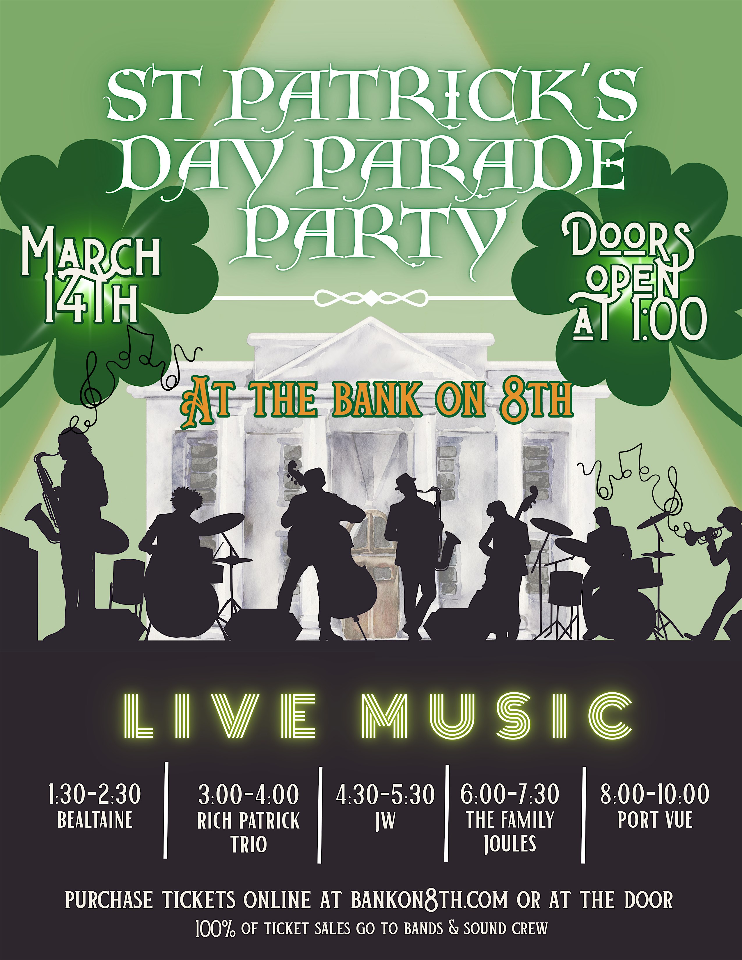 by admin13Feb St Patrick’s Parade Day at the Bank on 8th 2026 at The Bank on 8th – Homestead, PA St Patrick’s Parade Day at the Bank on 8th 2026 at The Bank on 8th – Homestead, PA 1 1 people viewed this event. St. Patricks Parade Day at The Bank on 8th Tickets-RSVP Link Date And Time Saturday, March 14th, 2026 05:00 PM (PST) Venue The Bank on 8th Location 145 East 8th Avenue, Homestead, PA 15120 Event Types Concert or PerformanceMusic Event Category Pennsylvania Share With Friends Facebook Twitter Linkedin Xing Pinterest Share This Post: