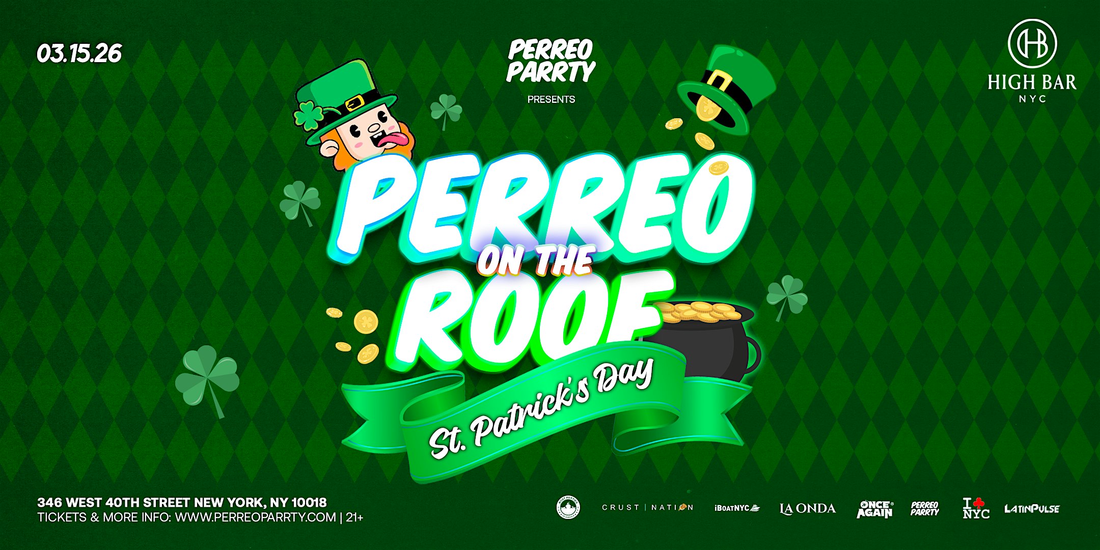 by admin27Feb St. Patrick’s Reggaeton – Latin & Perreo Rooftop Party Midtown NYC at High Bar New York – New York, NY St. Patrick’s Reggaeton – Latin & Perreo Rooftop Party Midtown NYC at High Bar New York – New York, NY 1 1 people viewed this event. Saturday Event Series in Midtown, NYC. Open-Air Outdoor Patio includes Indoor Enclosed Rooftop. Celebrating Latin Culture. Tickets-RSVP Link Date And Time Saturday, March 14th, 2026 08:00 PM (PST) Venue High Bar New York Location 346 West 40th Street, New York, NY 10018 Event Types MusicParty or Social Gathering Event Category New YorkNew York City Share With Friends Facebook Twitter Linkedin Xing Pinterest Share This Post: