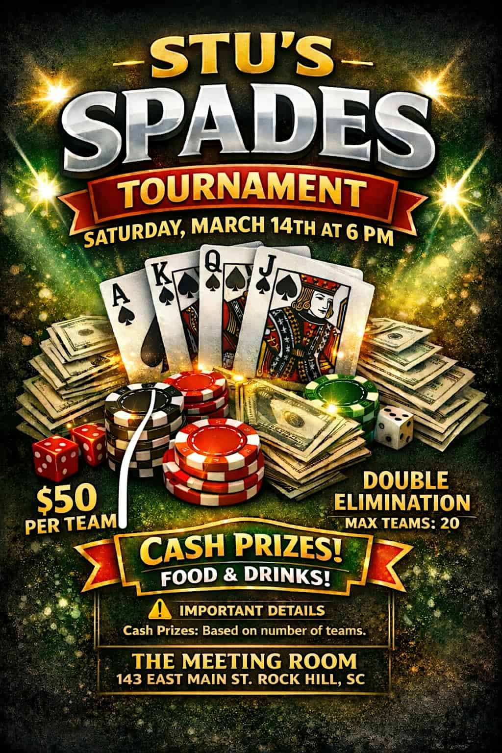 by admin14Feb Stu’s Spades ♠️ Tournament at The Meeting Room – Rock Hill, SC Stu’s Spades ♠️ Tournament at The Meeting Room – Rock Hill, SC 3 3 people viewed this event. ⸻ ♠️ STU’S SPADES TOURNAMENT ♠️ Get ready for an exciting night of competition, strategy, and fun at Stu’s Spades Tournament! Tickets-RSVP Link Date And Time Saturday, March 14th, 2026 10:00 PM (PST) Venue The Meeting Room Location 143 East Main Street, Rock Hill, SC 29730 Event Types Food & Drink Event Category South Carolina Share With Friends Facebook Twitter Linkedin Xing Pinterest Share This Post: