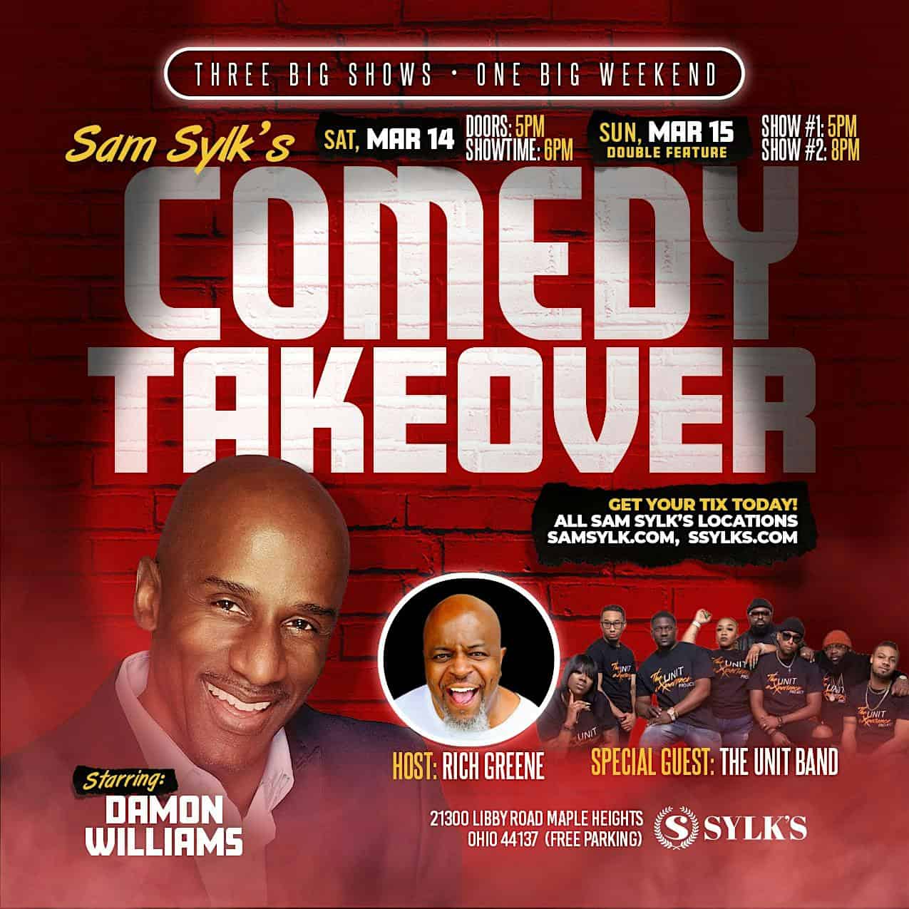by admin14Feb Sylk’s Comedy Takeover Starring Damon Williams at SAM SYLK’S – Maple Heights, OH Sylk’s Comedy Takeover Starring Damon Williams at SAM SYLK’S – Maple Heights, OH 2 2 people viewed this event. Get ready to laugh out loud with Damon Williams at Sylk’s Comedy Takeover—live and in person! Tickets-RSVP Link Date And Time Saturday, March 14th, 2026 09:00 PM (PST) Venue SAM SYLK'S Location 21300 Libby Road, Maple Heights, OH 44137 Event Types Concert or PerformancePerforming & Visual Arts Event Category ClevelandOhio Share With Friends Facebook Twitter Linkedin Xing Pinterest Share This Post: