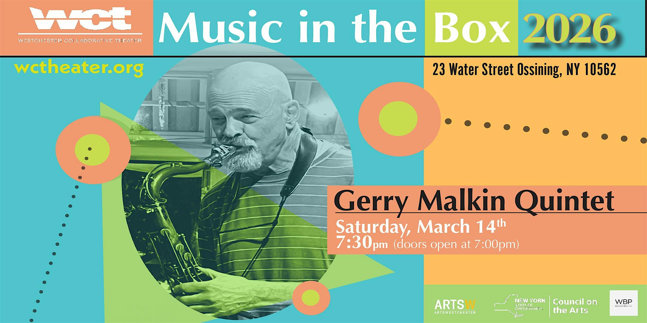 by admin27Feb The Gerry Malkin Quintet at Westchester Collaborative Theater (GPS 21 Water St.) – Ossining, NY The Gerry Malkin Quintet at Westchester Collaborative Theater (GPS 21 Water St.) – Ossining, NY 1 1 people viewed this event. The Gerry Malkin Quintet Performs ‘Post Bebop’ Sound at Westchester Collaborative Theater Saturday, March 14 Tickets-RSVP Link Date And Time Saturday, March 14th, 2026 07:00 PM (PST) Venue Westchester Collaborative Theater (GPS 21 Water St.) Location 23 Water Street, Ossining, NY 10562 Event Types Concert or PerformanceMusic Event Category New York Share With Friends Facebook Twitter Linkedin Xing Pinterest Share This Post: