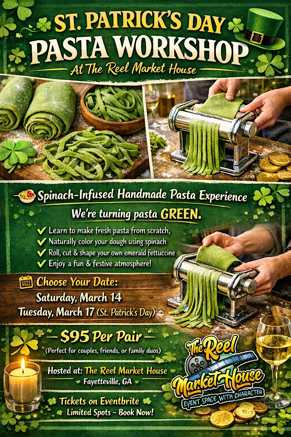 The Green Pasta Experience – St. Patrick’s Day Edition at The Reel Market House – Fayetteville, GA The Green Pasta Experience – St. Patrick’s Day Edition at The Reel Market House – Fayetteville, GA 1 1 people viewed this event. Get ready to dive into a fun, green-themed pasta making , that’s perfect for celebrating St. Paddy’s Day vibes! Tickets-RSVP Link Register for event Date And Time Saturday, March 14th, 2026 @ 04:00 PM Location 385 Glynn Street South, Fayetteville, GA 30214 Event Types Class, Training, or WorkshopFood & Drink Event Category AtlantaGeorgia Share With Friends Facebook Twitter Linkedin Xing Pinterest