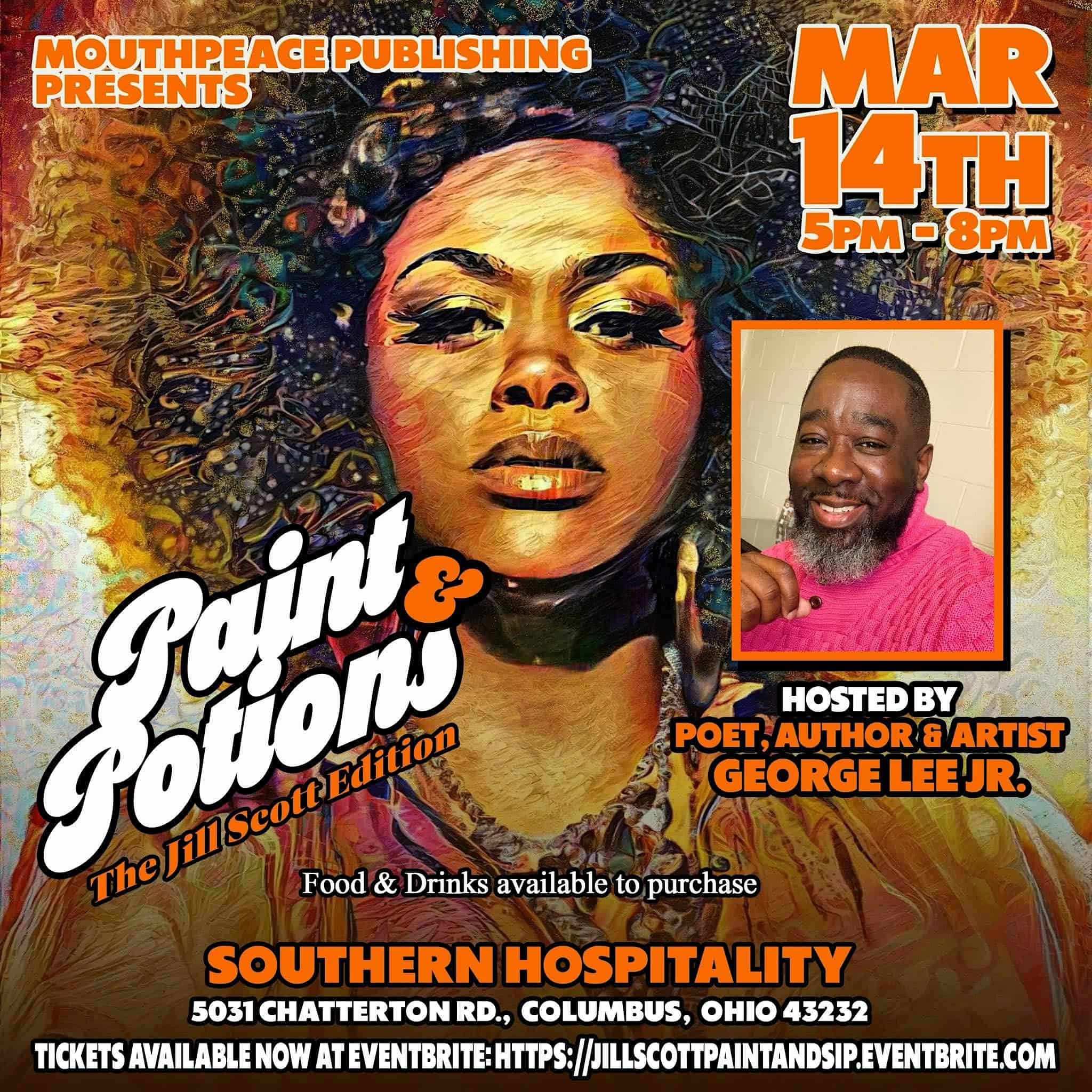 by admin14Feb The Jill Scott Edition of Paint & Potions at Southern Hospitality – Soho 614 – Columbus, OH The Jill Scott Edition of Paint & Potions at Southern Hospitality – Soho 614 – Columbus, OH 2 2 people viewed this event. Come join us as we pay tribute to one of the Queens of Neo-Soul, Jill Scott through art and music. Tickets-RSVP Link Date And Time Saturday, March 14th, 2026 09:00 PM (PST) Venue Southern Hospitality - Soho 614 Location 5031 Chatterton Road, Columbus, OH 43232 Event Types Party or Social GatheringPerforming & Visual Arts Event Category Ohio Share With Friends Facebook Twitter Linkedin Xing Pinterest Share This Post: