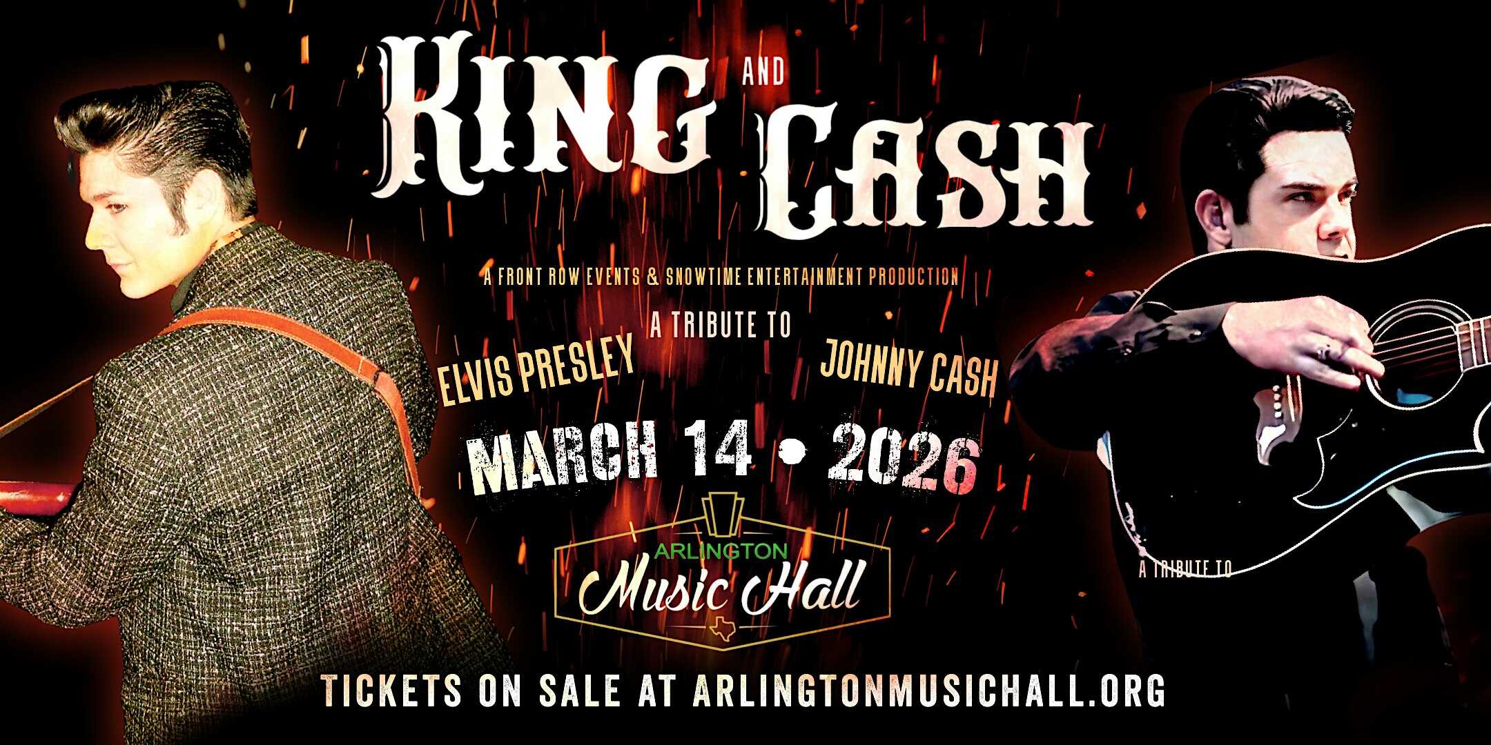 by admin23Feb THE KING AND CASH: A TRIBUTE TO ELVIS PRESLEY & JOHNNY CASH at Arlington Music Hall – Arlington, TX THE KING AND CASH: A TRIBUTE TO ELVIS PRESLEY & JOHNNY CASH at Arlington Music Hall – Arlington, TX 1 1 people viewed this event. Come celebrate the music of Elvis Presley and Johnny Cash with us at “THE KING AND CASH” tribute event! Tickets-RSVP Link Date And Time Saturday, March 14th, 2026 07:00 PM (PST) Venue Arlington Music Hall Location 224 N Center St, Arlington, TX 76011 Event Types Concert or PerformanceMusic Event Category Texas Share With Friends Facebook Twitter Linkedin Xing Pinterest Share This Post: