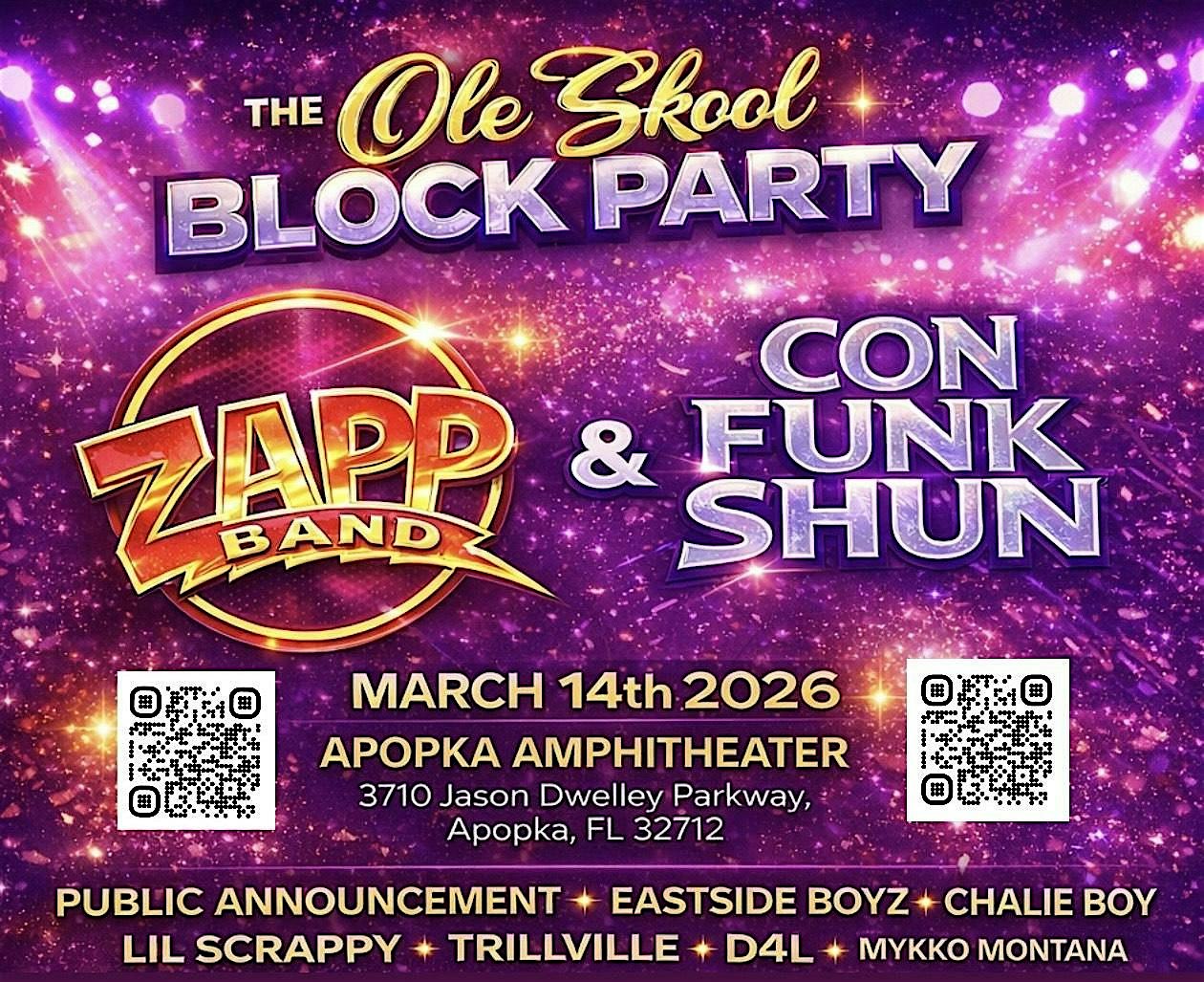 by admin13Feb The Ole Skool Block Party: Zapp & Con Funk Shun + MORE at Apopka Amphitheater – Apopka, FL The Ole Skool Block Party: Zapp & Con Funk Shun + MORE at Apopka Amphitheater – Apopka, FL 1 1 people viewed this event. Get ready to vibe and rewind at The Ole Skool Block Party – the ultimate throwback reunion! Tickets-RSVP Link Date And Time Saturday, March 14th, 2026 07:00 PM (PST) Venue Apopka Amphitheater Location 3710 Jason Dwelley Parkway, Apopka, FL 32712 Event Types MusicParty or Social Gathering Event Category FloridaOrlando Share With Friends Facebook Twitter Linkedin Xing Pinterest Share This Post: