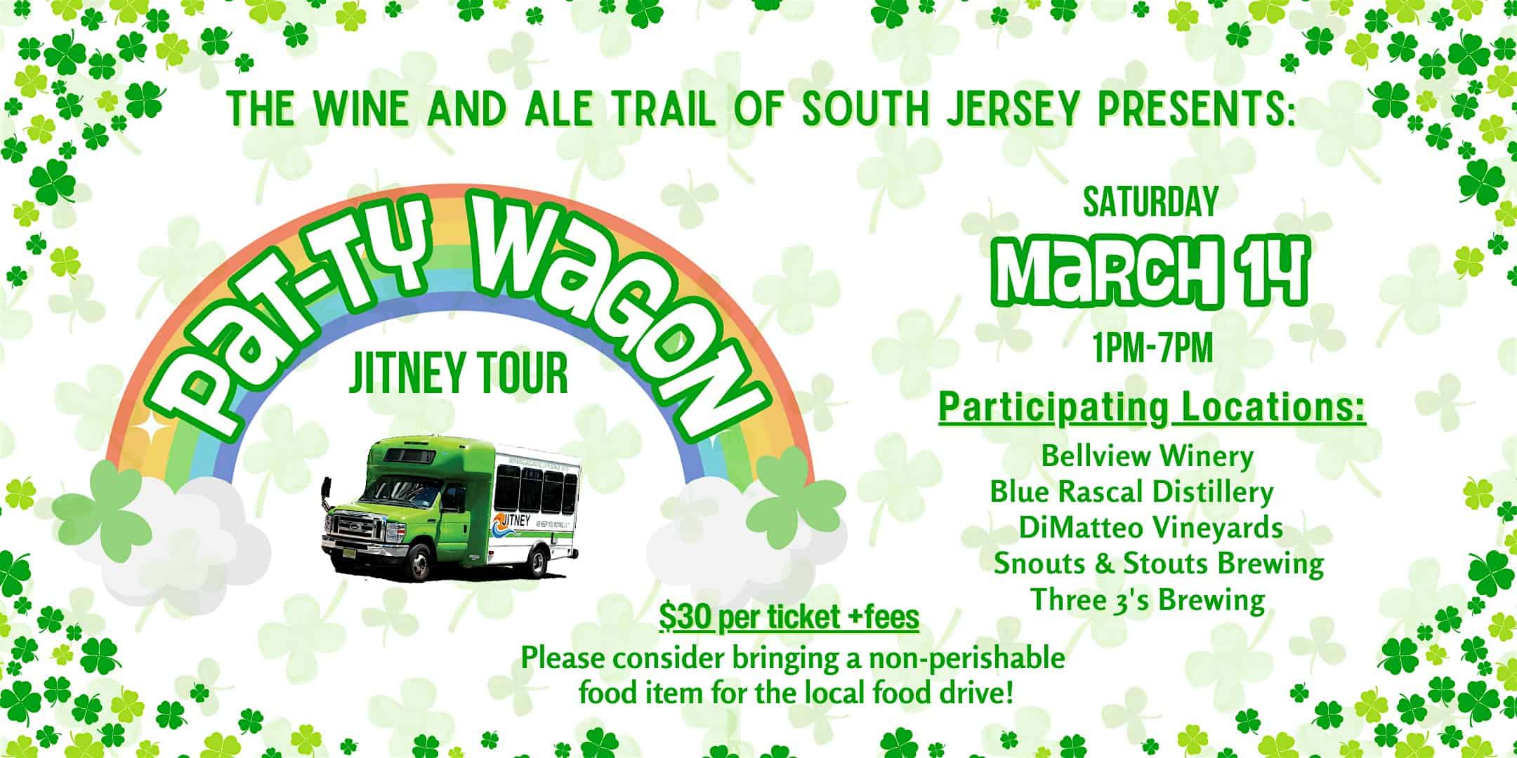 by admin14Feb The Pat-ty Wagon Jitney Tour at Hammonton – Hammonton, NJ The Pat-ty Wagon Jitney Tour at Hammonton – Hammonton, NJ 3 3 people viewed this event. Ride the South Jersey Wine and Ale Trail on our St Patrick’s Themed Jitney tour! Visit wineries, breweries, and a distillery Tickets-RSVP Link Date And Time Saturday, March 14th, 2026 05:00 PM (PST) Venue Hammonton Location Horton St, Hammonton, NJ 8037 Event Types Food & Drink Event Category New Jersey Share With Friends Facebook Twitter Linkedin Xing Pinterest Share This Post: