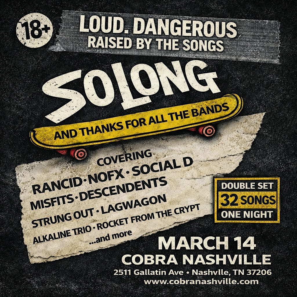 by admin23Feb Venue: So Long and Thanks for All the Bands | 32 Punk Covers at Cobra Nashville – Nashville, TN Venue: So Long and Thanks for All the Bands | 32 Punk Covers at Cobra Nashville – Nashville, TN 1 1 people viewed this event. 18 and UP + Tickets-RSVP Link Date And Time Saturday, March 14th, 2026 07:00 PM (PST) Venue Cobra Nashville Location 2511 Gallatin Avenue, Nashville, TN 37206 Event Types Concert or PerformanceMusic Event Category NashvilleTennessee Share With Friends Facebook Twitter Linkedin Xing Pinterest Share This Post: