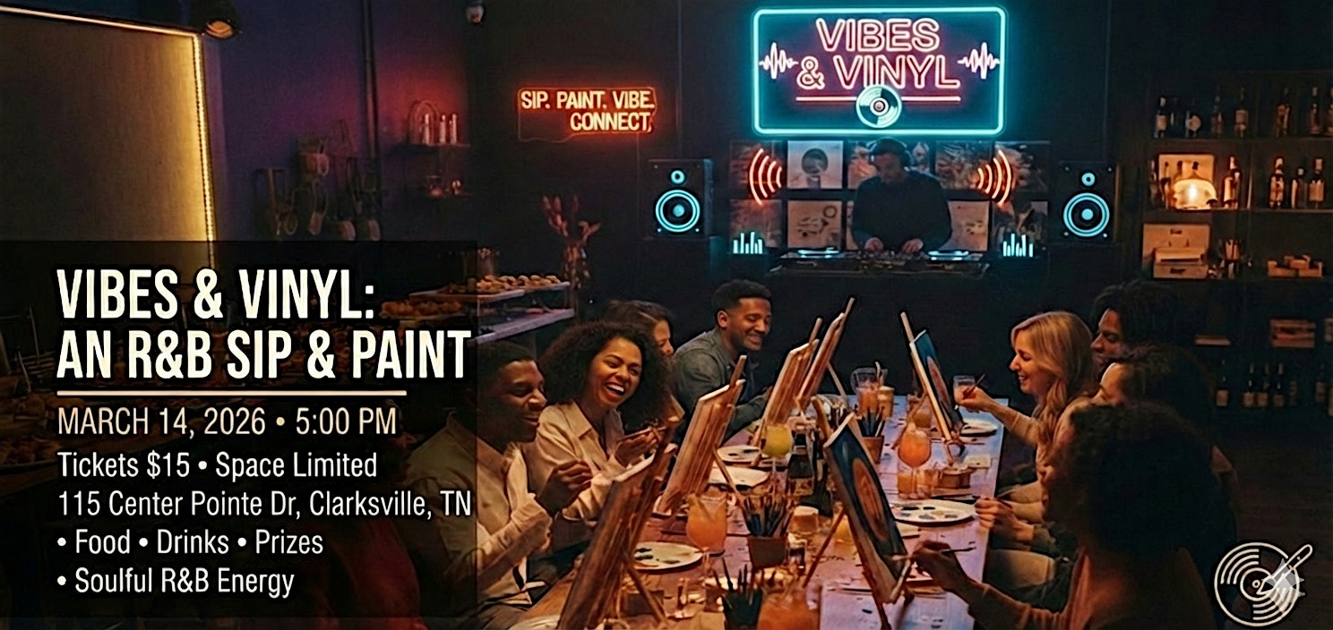 by admin13Feb Vibes & Vinyl: An R&B Sip & Paint Event at 115 Center Pointe Dr – Clarksville, TN Vibes & Vinyl: An R&B Sip & Paint Event at 115 Center Pointe Dr – Clarksville, TN 1 1 people viewed this event. An elevated R&B sip & paint night. Enjoy soulful music, food, drinks & relaxing painting. March 14, 2026 @ 5PM. Tickets just $15! Tickets-RSVP Link Date And Time Saturday, March 14th, 2026 10:00 PM (PST) Venue 115 Center Pointe Dr Location 115 Center Pointe Drive, Clarksville, TN 37040 Event Types Food & DrinkParty or Social Gathering Event Category Tennessee Share With Friends Facebook Twitter Linkedin Xing Pinterest Share This Post: