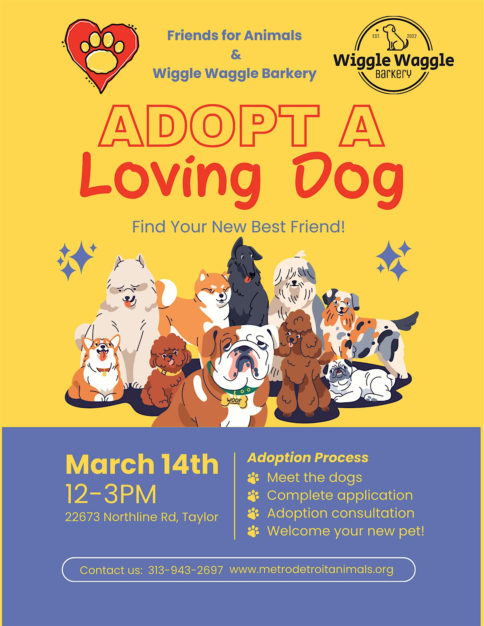 by admin27Feb Wiggle Waggle Barkery Adoption Event at Wiggle Waggle Barkery – Taylor, MI Wiggle Waggle Barkery Adoption Event at Wiggle Waggle Barkery – Taylor, MI 1 1 people viewed this event. *Dog only adoption event. Tickets-RSVP Link Date And Time Saturday, March 14th, 2026 @ 12:00 PM Location 22673 Northline Road, Taylor, MI 48180 Event Types Charity & CausesParty or Social Gathering Event Category DetroitMichigan Share With Friends Facebook Twitter Linkedin Xing Pinterest Share This Post: