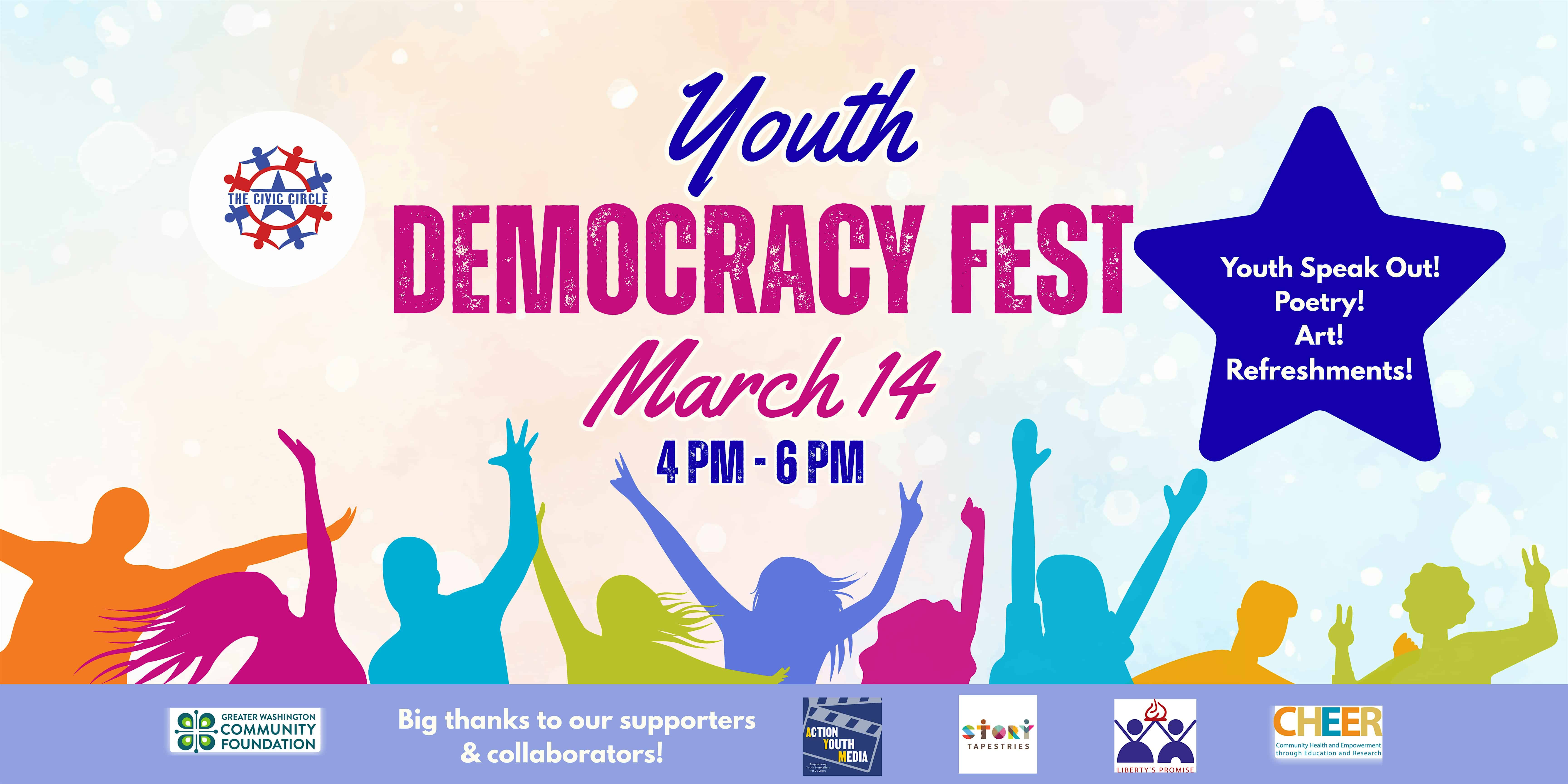 by admin14Feb Youth Democracy Fest at Takoma Park Community Center – Takoma Park, MD Youth Democracy Fest at Takoma Park Community Center – Takoma Park, MD 3 3 people viewed this event. Celebrate youth poetry, song, story and art at The Civic Circle’s Youth Democracy Fest, a community gathering to lift student voices. Tickets-RSVP Link Date And Time Saturday, March 14th, 2026 08:00 PM (PST) Venue Takoma Park Community Center Location 7500 Maple Avenue, Takoma Park, MD 20912 Event Types Community & CultureConcert or Performance Event Category MarylandNational Harbor Share With Friends Facebook Twitter Linkedin Xing Pinterest Share This Post:
