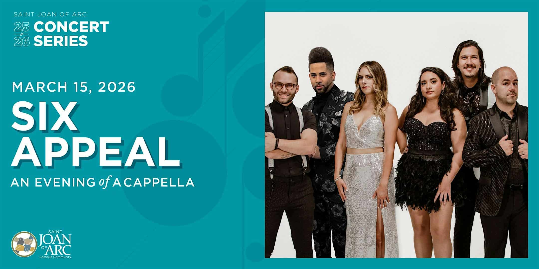 by admin23Feb 2025-2026 Concert Series – “SIX APPEAL” at St. Joan of Arc Catholic Community – Gym Auditorium – Minneapolis, MN 2025-2026 Concert Series – “SIX APPEAL” at St. Joan of Arc Catholic Community – Gym Auditorium – Minneapolis, MN 3 3 people viewed this event. An evening of a cappella music Tickets-RSVP Link Date And Time Sunday, March 15th, 2026 07:00 PM (PST) Venue St. Joan of Arc Catholic Community - Gym Auditorium Location 4537 3rd Avenue South, Minneapolis, MN 55419 Event Types Concert or PerformanceMusic Event Category MinneapolisMinnesota Share With Friends Facebook Twitter Linkedin Xing Pinterest Share This Post: