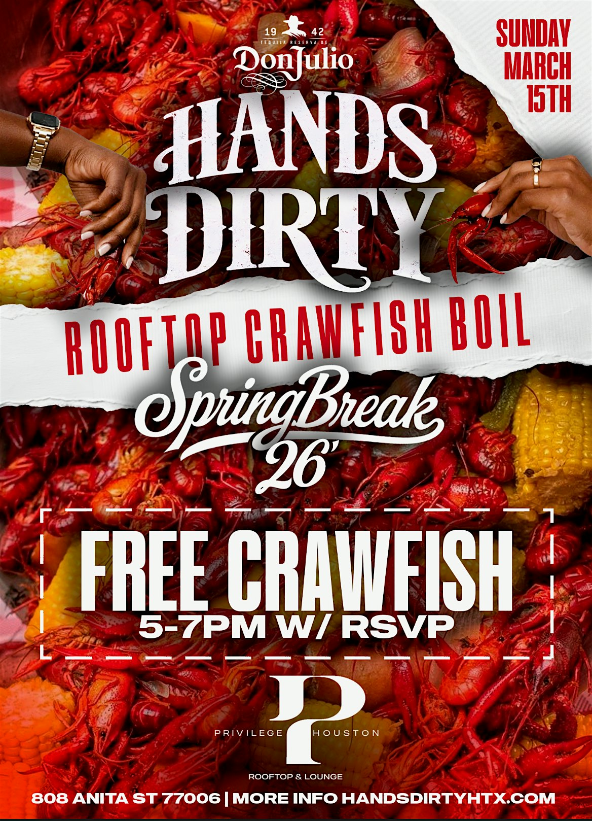 by admin27Feb 3.15 | HANDS DIRTY Spring Break Rooftop Crawfish Boil At Privilege at Privilege Houston – Houston, TX 3.15 | HANDS DIRTY Spring Break Rooftop Crawfish Boil At Privilege at Privilege Houston – Houston, TX 1 1 people viewed this event. The biggest Spring Break Crawfish Boil, Sun. March 15 @ Privilege | More Info 832.419.9826 Tickets-RSVP Link Date And Time Sunday, March 15th, 2026 05:00 PM (PST) Venue Privilege Houston Location 808 Anita, Houston, TX 77006 Event Types Food & DrinkParty or Social Gathering Event Category HoustonTexas Share With Friends Facebook Twitter Linkedin Xing Pinterest Share This Post: