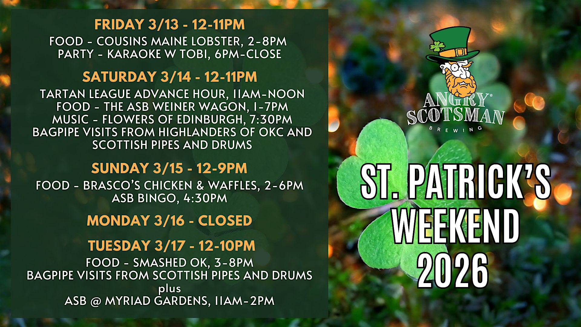 8th Annual St Patrick’s Weekend Party at Angry Scotsman Brewing at Angry Scotsman Brewing – Oklahoma City, OK 8th Annual St Patrick’s Weekend Party at Angry Scotsman Brewing at Angry Scotsman Brewing – Oklahoma City, OK 1 1 people viewed this event. Food trucks, live music, bagpipes, karaoke, bingo, and green beer galore. It’s a whole weekend of Celtic cheer. Tickets-RSVP Link Register for event Date And Time Sunday, March 15th, 2026 @ 12:00 PM Location 704 West Reno Avenue Event Types Food & DrinkParty or Social GatheringSt. Patricks Day Event Category OklahomaOklahoma City Share With Friends Facebook Twitter Linkedin Xing Pinterest