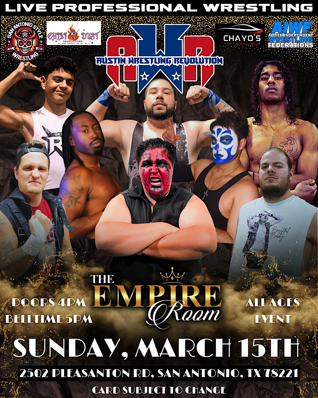 AWR: Shockwave at The Empire Room – San Antonio, TX AWR: Shockwave at The Empire Room – San Antonio, TX 1 1 people viewed this event. Live pro wrestling party at The Empire Room! Action, surprises & family chaos. You don’t watch AWR — you EXPERIENCE it! Tickets-RSVP Link Register for event Date And Time Sunday, March 15th, 2026 @ 04:00 PM Location 2502 Pleasanton Road, San Antonio, TX 78221 Event Types Concert or Performance Event Category San AntonioTexas Share With Friends Facebook Twitter Linkedin Xing Pinterest
