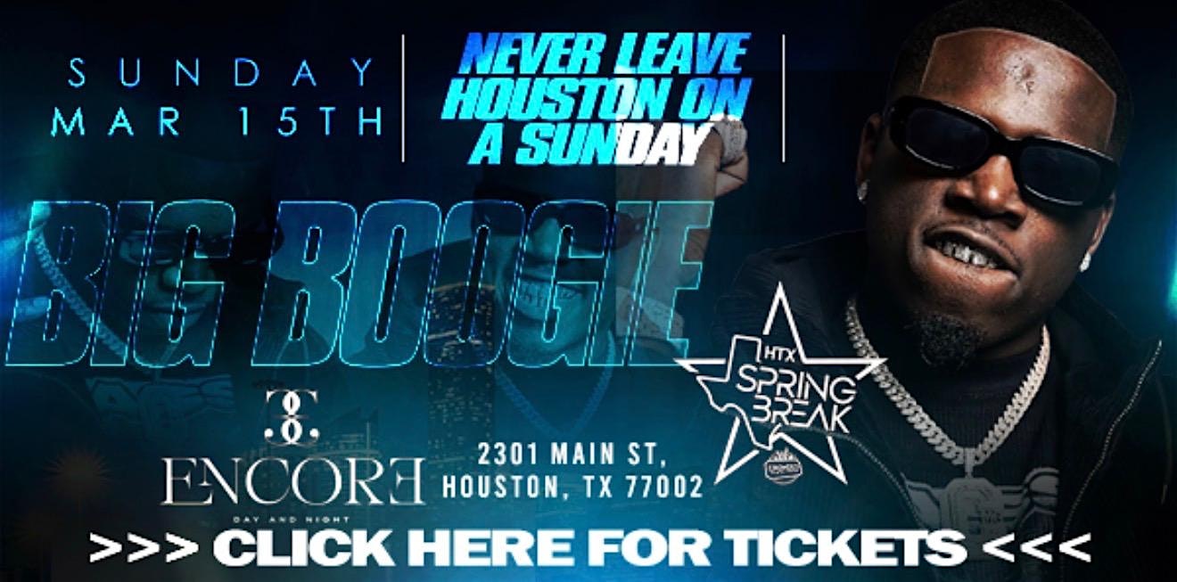 BIG BOOGIE LIVE – NEVER LEAVE HOUSTON ON A SUNDAY at The Encore – Houston, TX BIG BOOGIE LIVE – NEVER LEAVE HOUSTON ON A SUNDAY at The Encore – Houston, TX 1 1 people viewed this event. EVERYONE INVITED View all 2026 Houston Spring Break Parties Tickets-RSVP Link Register for event Date And Time Sunday, March 15th, 2026 @ 09:00 PM Location 2301 Main Street Event Types Concert or PerformanceHouston Spring BreakMusic Event Category HoustonTexas Share With Friends Facebook Twitter Linkedin Xing Pinterest