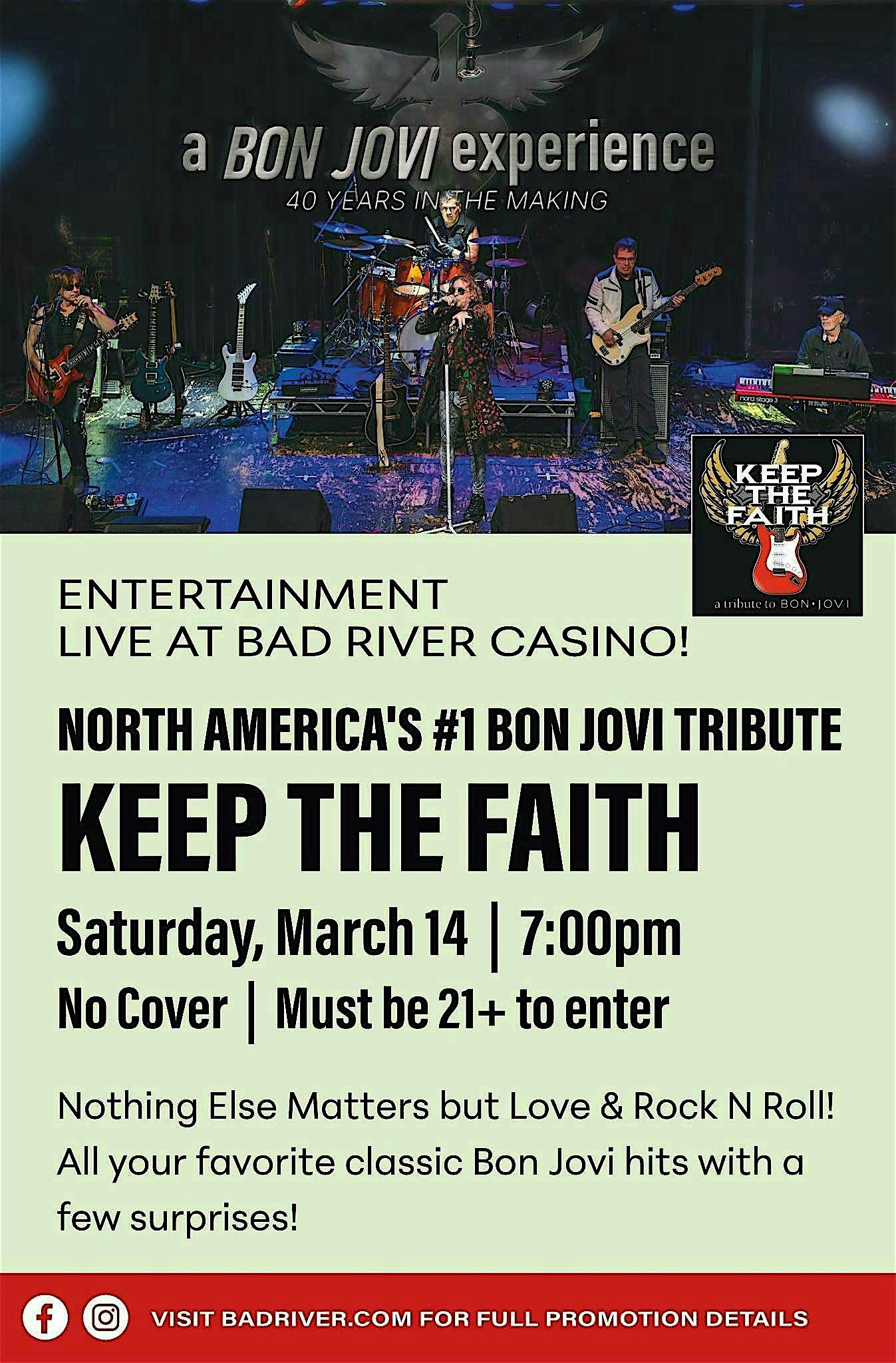 by admin13Feb BON JOVI TRIBUTE at Bad River Lodge & Casino – Ashland, WI BON JOVI TRIBUTE at Bad River Lodge & Casino – Ashland, WI 1 1 people viewed this event. Get ready to rock out live with the ultimate BON JOVI TRIBUTE – all your favorites, pure energy! Tickets-RSVP Link Date And Time Sunday, March 15th, 2026 12:00 AM (PST) Venue Bad River Lodge & Casino Location 73370 U.S. 2, Ashland, WI 54806 Event Types Concert or PerformanceMusic Event Category Wisconsin Share With Friends Facebook Twitter Linkedin Xing Pinterest Share This Post:
