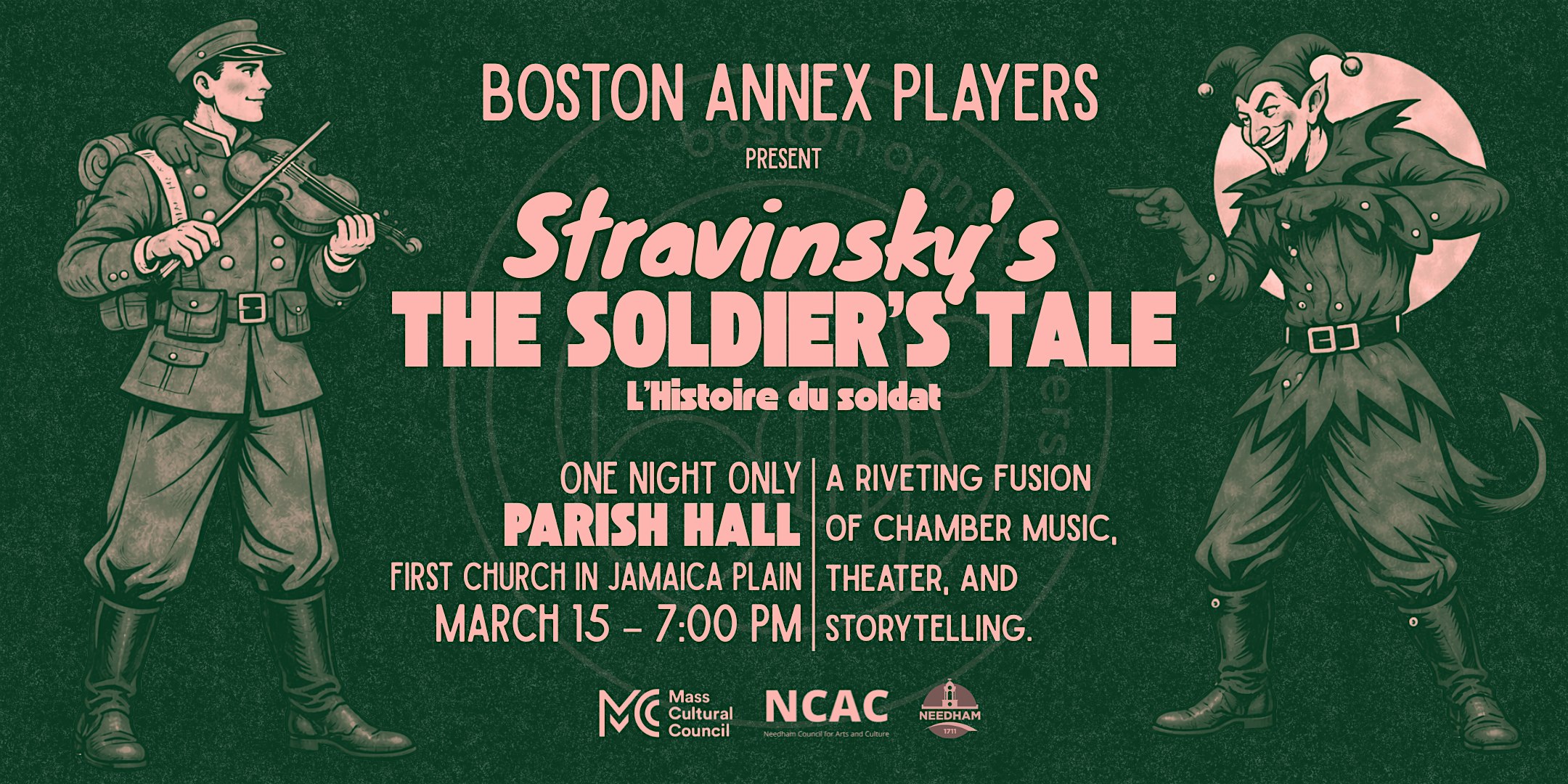 by admin05Mar Concert II: The Soldier’s Tale (Jamaica Plain) at First Church In Jamaica Plain – Boston, MA Concert II: The Soldier’s Tale (Jamaica Plain) at First Church In Jamaica Plain – Boston, MA 1 1 people viewed this event. Boston Annex Players bring Stravinsky’s Soldier’s Tale to life—sharp rhythms, vivid storytelling, and a playful clash of music & theater. Tickets-RSVP Link Date And Time Sunday, March 15th, 2026 07:00 PM (PST) Venue First Church In Jamaica Plain Location 6 Eliot Street, Boston, MA 2130 Event Types Concert or PerformancePerforming & Visual Arts Event Category BostonMassachusetts Share With Friends Facebook Twitter Linkedin Xing Pinterest Share This Post: