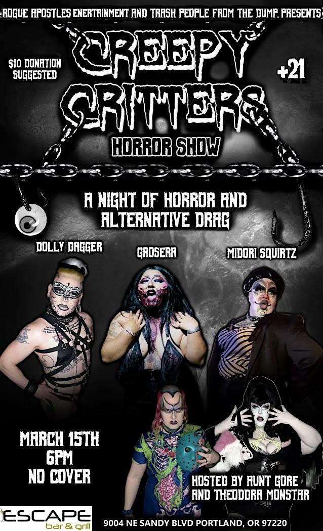 by admin05Mar Creepy Critters Horror Show At Escape Bar & Grill at Escape Bar & Grill – Portland, OR Creepy Critters Horror Show At Escape Bar & Grill at Escape Bar & Grill – Portland, OR 2 2 people viewed this event. Escape Bar & Grill’s Monthly Horror & Alternative Drag Showcase, featuring some of your Favorite Local Drag Performers! No Cover. Tickets-RSVP Link Date And Time Sunday, March 15th, 2026 06:00 PM (PST) Venue Escape Bar & Grill Location 9004 Northeast Sandy Boulevard, Portland, OR 97220 Event Types Concert or PerformancePerforming & Visual Arts Event Category OregonPortland Share With Friends Facebook Twitter Linkedin Xing Pinterest Share This Post: