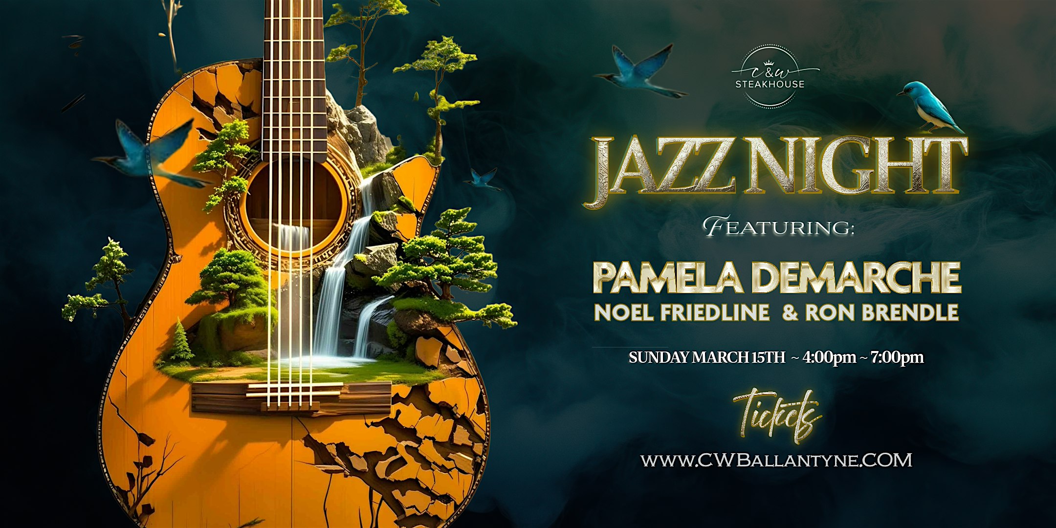 by admin27Feb CW Steakhouse ~ Jazz Night ~ Pamela DeMarche | Noel Friedline | Ron Brendle at C&W Steakhouse – Charlotte, NC CW Steakhouse ~ Jazz Night ~ Pamela DeMarche | Noel Friedline | Ron Brendle at C&W Steakhouse – Charlotte, NC 1 1 people viewed this event. CW Jazz Night ~ Ballantyne on Sunday, March 15th! Featuring Pamela Demarche (vocals), Noel Friedline (piano), and Ron Brendle (bass). Tickets-RSVP Link Date And Time Sunday, March 15th, 2026 04:00 PM (PST) Venue C&W Steakhouse Location 14825 Ballantyne Village Way, Charlotte, NC 28277 Event Types Concert or PerformanceMusic Event Category CharlotteNorth Carolina Share With Friends Facebook Twitter Linkedin Xing Pinterest Share This Post:
